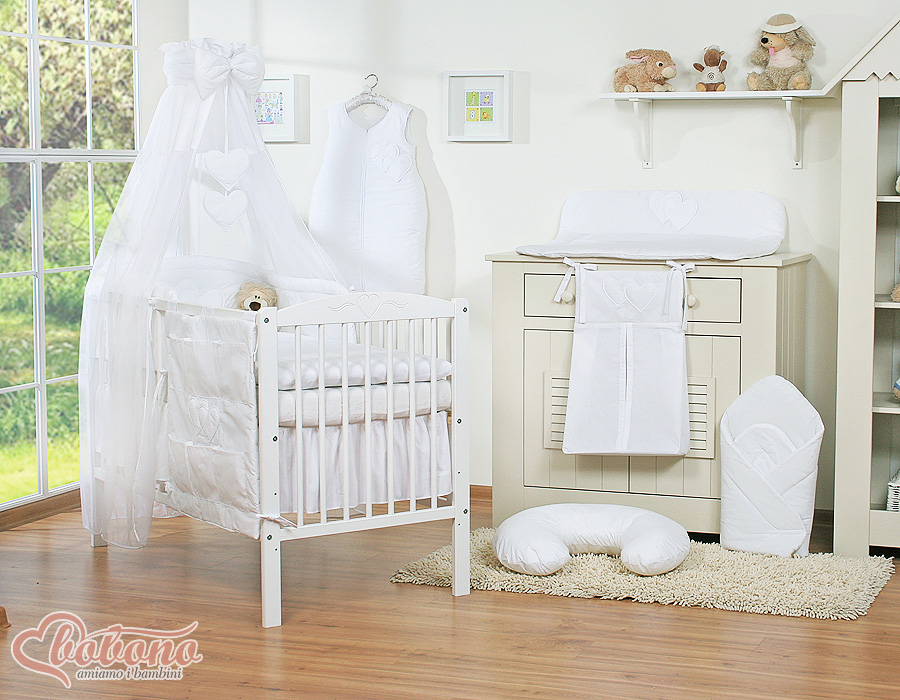 Baby Bed Bedding set 7-pcs with canopy- Hanging Hearts white In the lovingly designed bedding it wonderful to sleep. Skin-friendly quality invites you to dream.