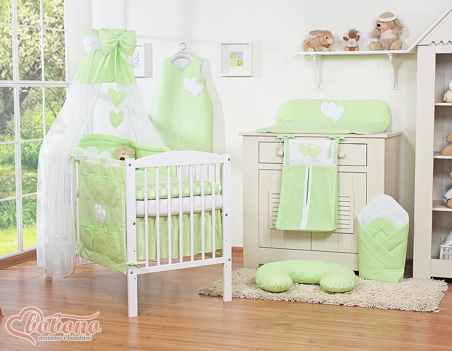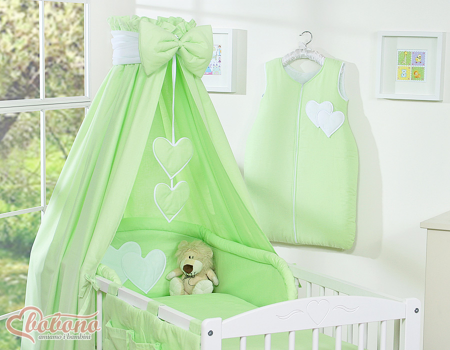 Baby Bedding set 5-pcs- with canopy- Hanging Hearts green In the lovingly designed bedding it wonderful to sleep. Skin-friendly quality invites you to dream.