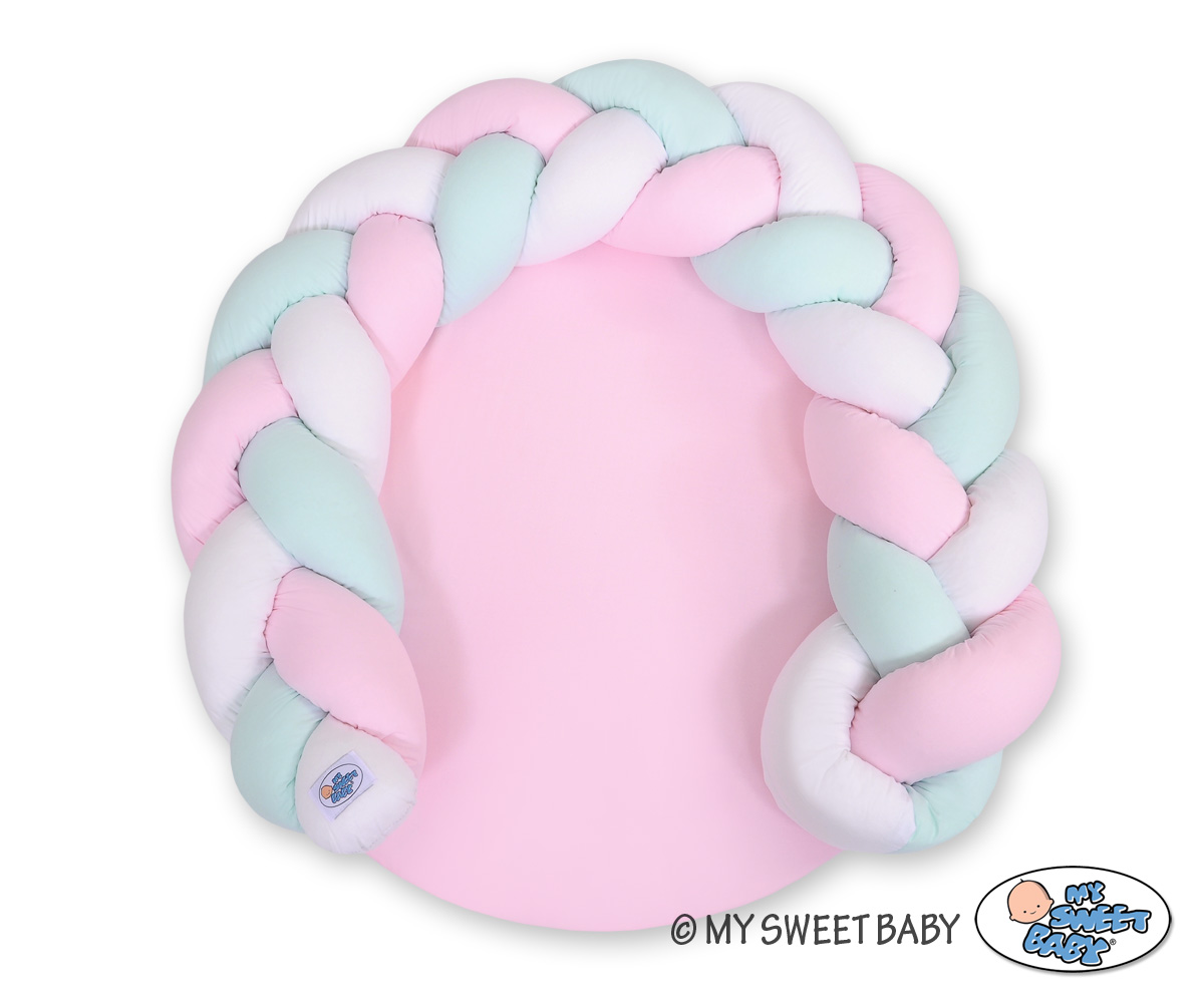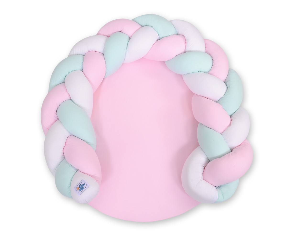 Multifunctional braided baby donut pillow. This two in one pillow can be used as a donut pillow for your baby to lie down on or untie the ribbons and use the braid as a cot bumper. The baby donut pillow is a great solution from the first months of the baby's life. It can be used from the first days as a safe baby nest and later as a cozy place to play.
