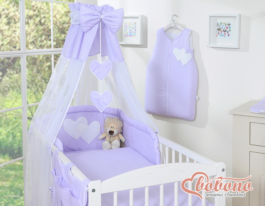 Baby Cot 120x60 140x70 Bedding set 11-pcs with canopy plus stand- Hanging Hearts white dots on lilacBaby Cot 120x60 140x70 Bedding set 11-pcs with canopy plus stand- Hanging Hearts white dots on lilacBaby Cot 120x60 140x70 Bedding set 11-pcs with canopy plus stand- Hanging Hearts white dots on lilacBaby Cot 120x60 140x70 Bedding set 11-pcs with canopy plus stand- Hanging Hearts white dots on lilac