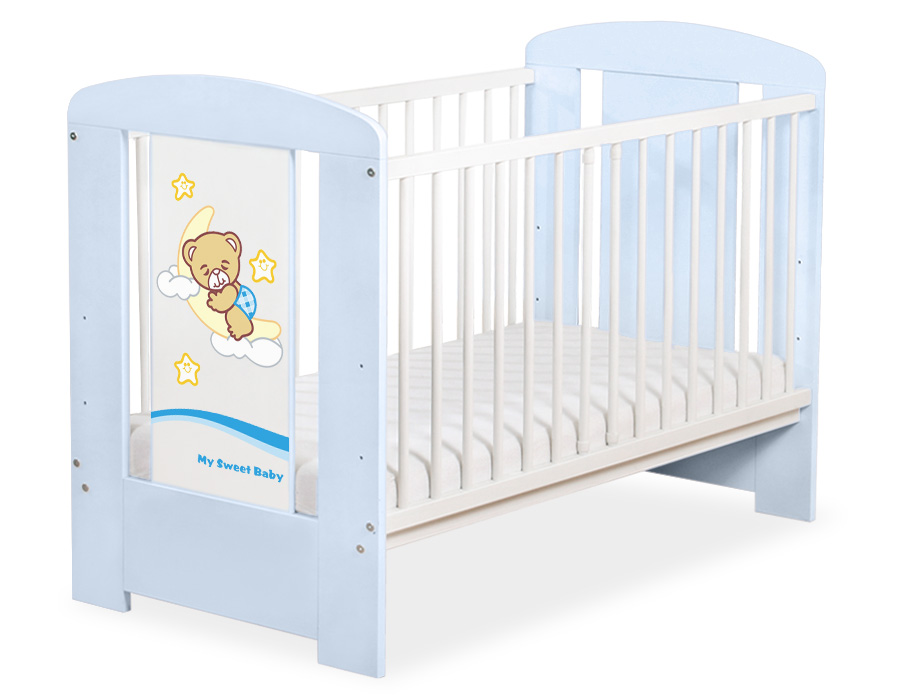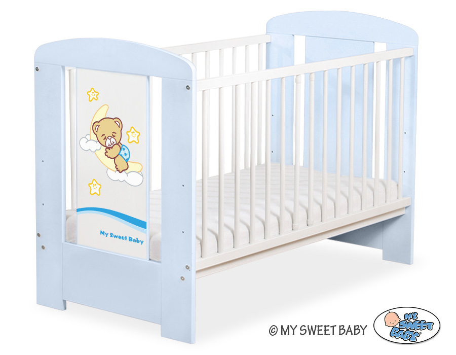 - stable and safe cot for your baby, it is also a beautifull room decoration, it looks beautifull with bedding set from Good Night collection. - front and back are made of melamine faced chipboard. On the front of cot the graphic that fits to the bedding Good Night.