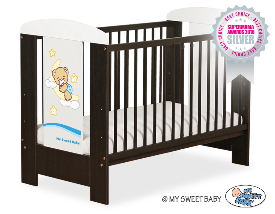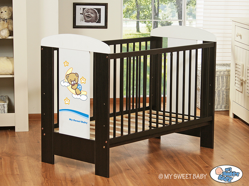 - stable and safe cot for your baby, it is also a beautifull room decoration, it looks beautifull with bedding set from Good Night collection. - front and back are made of melamine faced chipboard. On the front of cot the graphic that fits to the bedding Good Night.