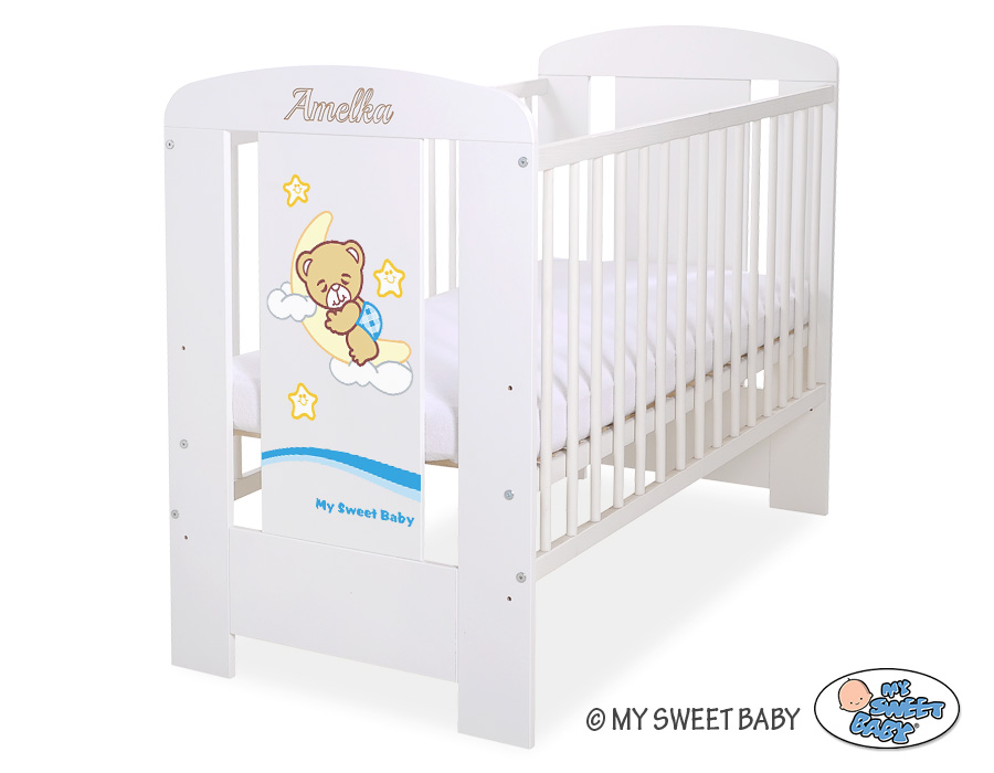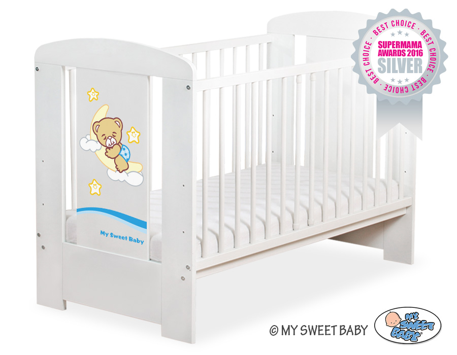- stable and safe cot for your baby, it is also a beautifull room decoration, it looks beautifull with bedding set from Good Night collection. - front and back are made of melamine faced chipboard. On the front of cot the graphic that fits to the bedding Good Night.