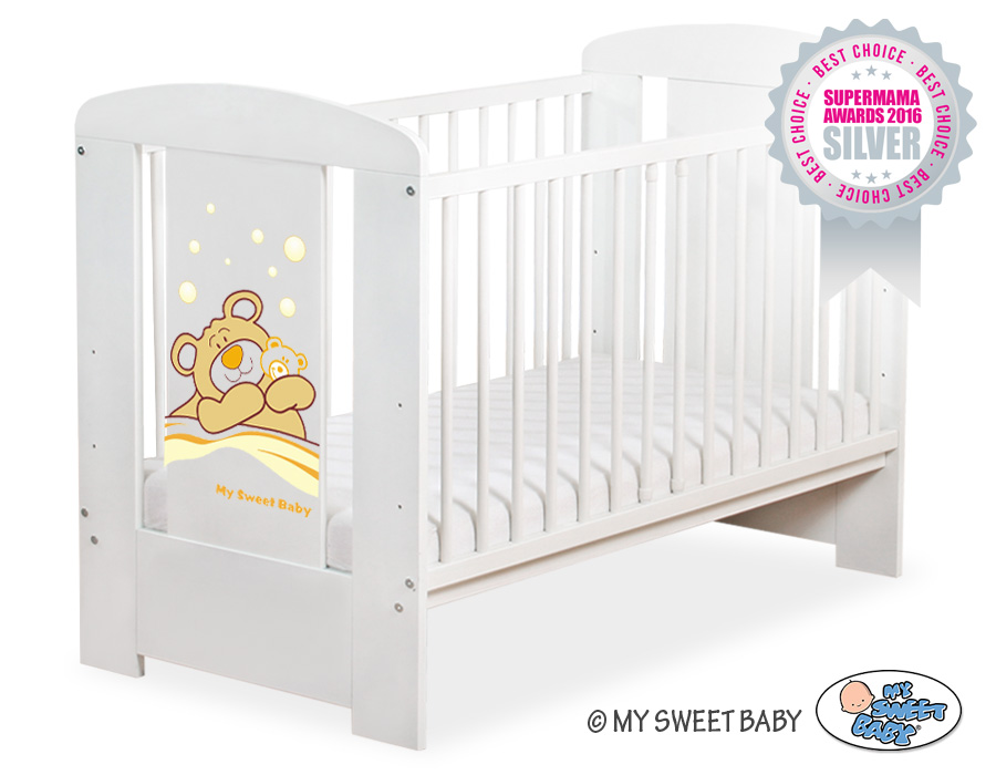 Baby cot bed 120x60cm Tedy Bear Barnaba White Model: 804 The most beautiful wooden baby cot. Removable rungs, three levels of height of mattress frame.