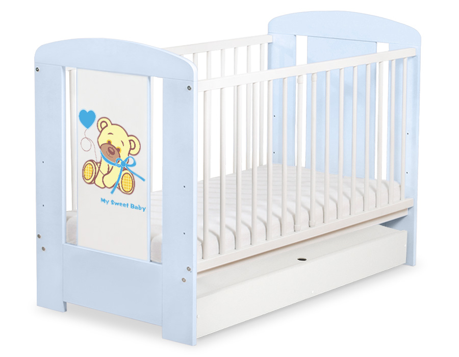 - stable and safe cot for your baby, it is also a beautifull room decoration, it looks beautifull with bedding set from Teddy Bear with bow collection. - front and back are made of melamine faced chipboard. On the front of cot the graphic that fits to the bedding Teddy Bear with bow.