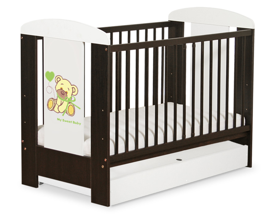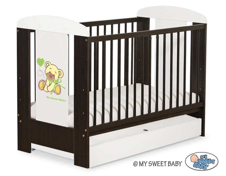 - stable and safe cot for your baby, it is also a beautifull room decoration, it looks beautifull with bedding set from Teddy Bear with bow collection. - front and back are made of melamine faced chipboard. On the front of cot the graphic that fits to the bedding Teddy Bear with bow.