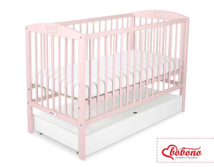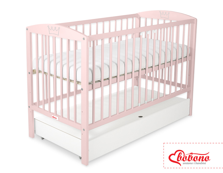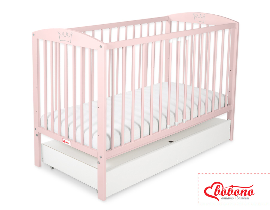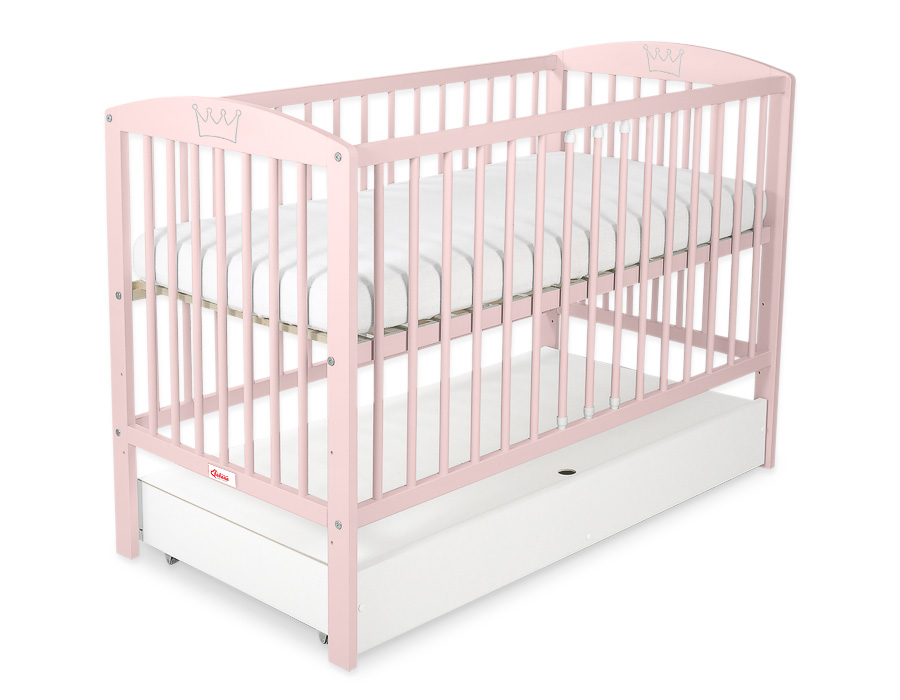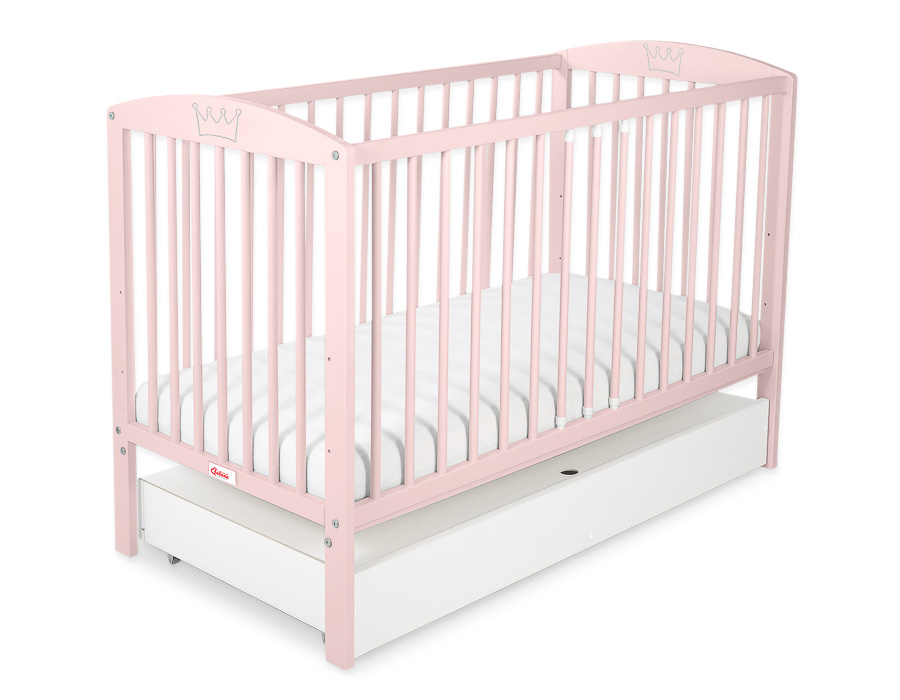 Baby cot bed 120x60cm with crown no. 5006-01- powder pink with drawer STANDARD Wooden baby cot with crown with drawer STANDARD
