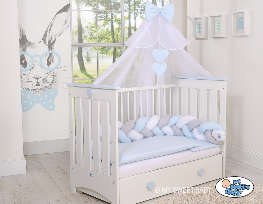 Baby Cot Bed Mosquito-net made of tulle- white hearts with blue Mosquito net universally suitable for beds 140x70cm and 120x60cm. Suitable for all cots, looks very decorative.
