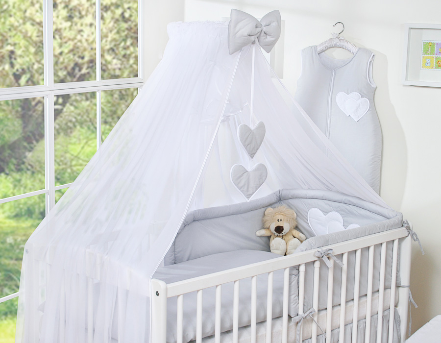 Baby cot Bedding set 5-pcs with mosquito-net- Hanging Hearts Gray In the lovingly designed bedding it wonderful to sleep. Skin-friendly quality invites you to dream. Baby bedding set 5pcs with mosquito-net- Collection Hanging Hearts