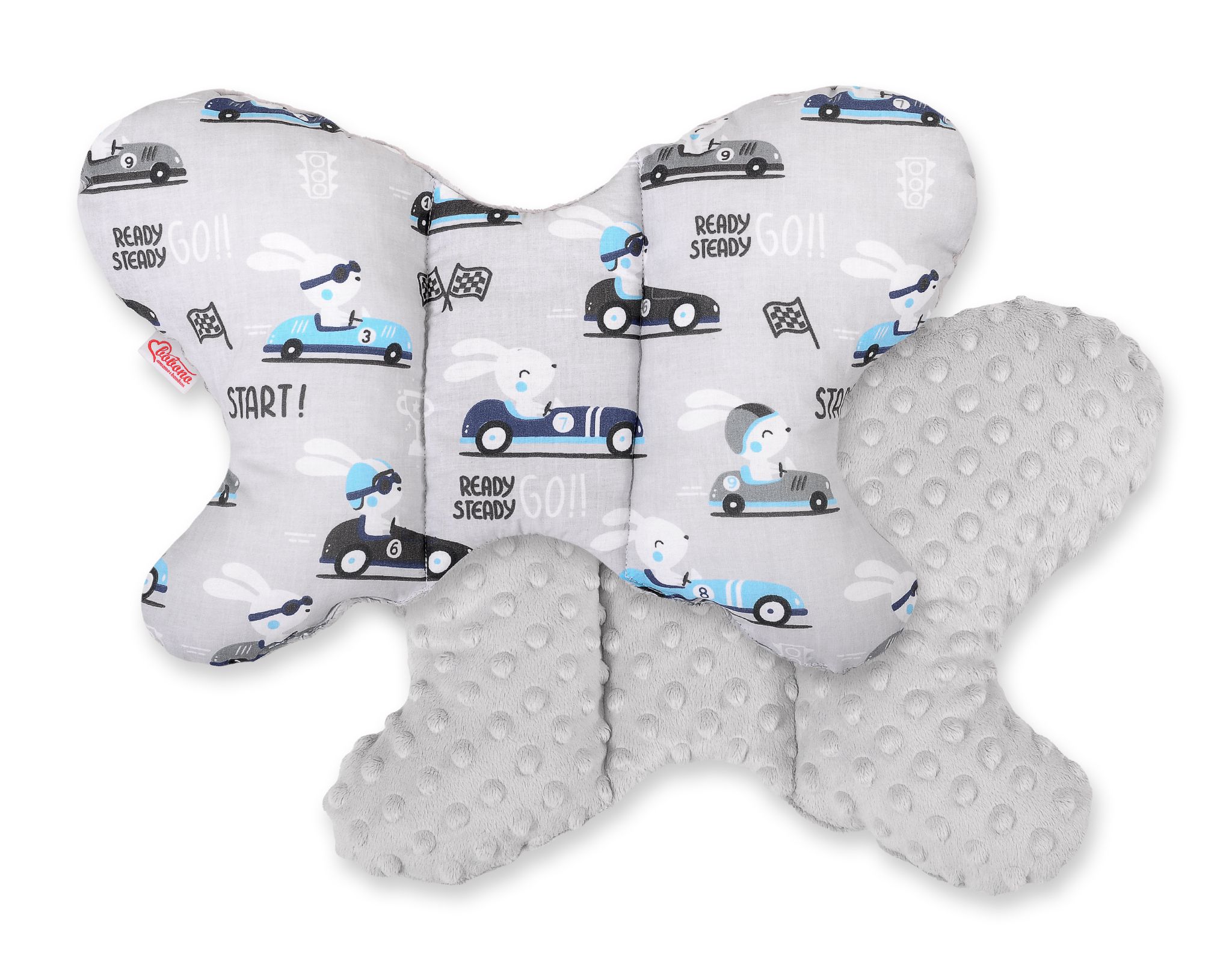 A butterfly cushion shape keeps correct head position at all times. It minimizes microshocks while the journey or while walking on uneven ground.