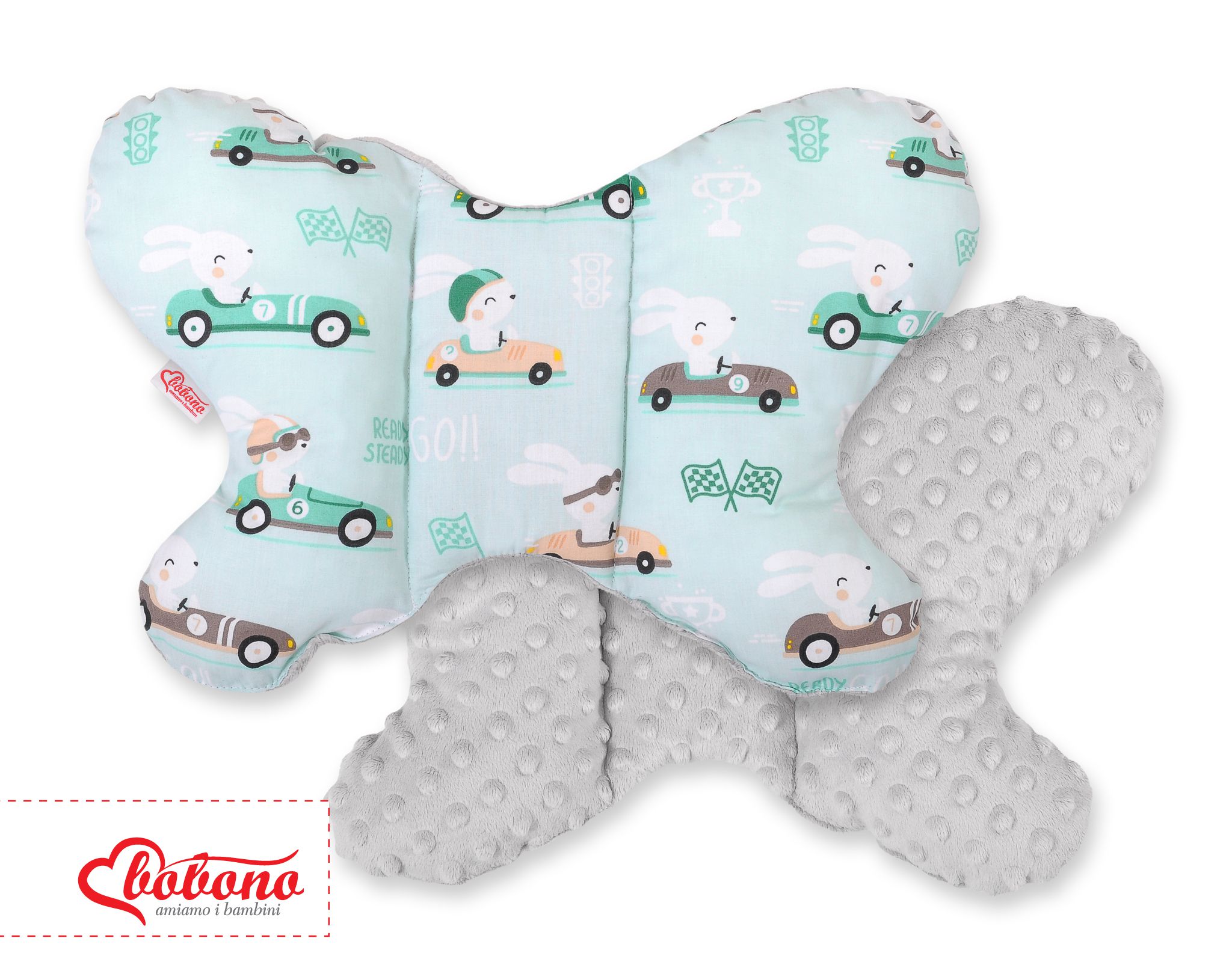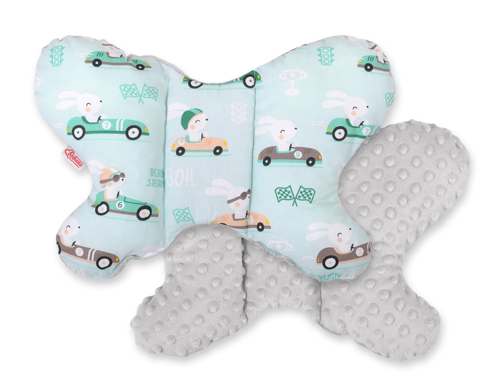 A butterfly cushion shape keeps correct head position at all times. It minimizes microshocks while the journey or while walking on uneven ground.