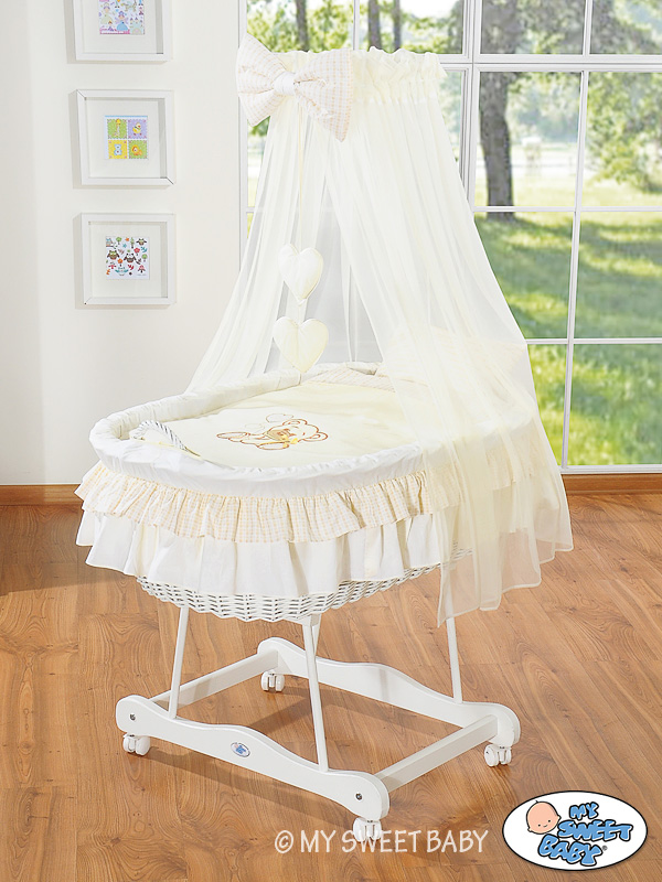 A beautiful basket. The biggest bassinet on the market. A white color of wicker and wood.