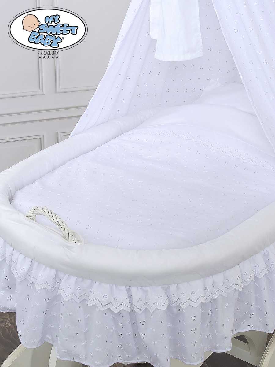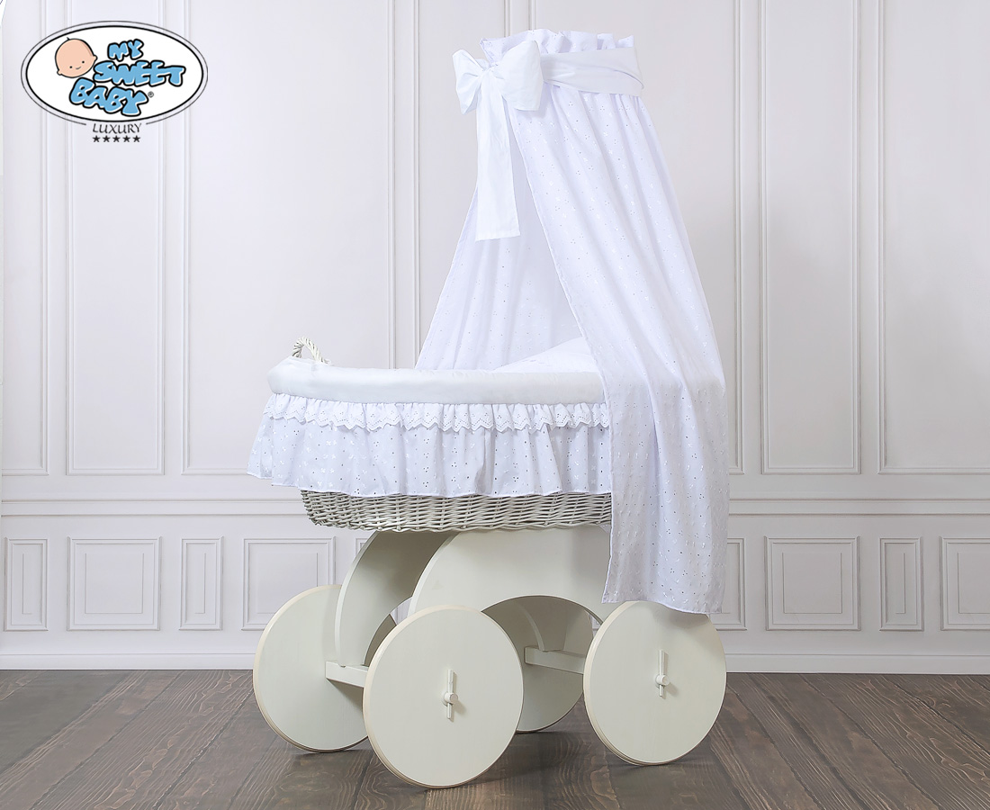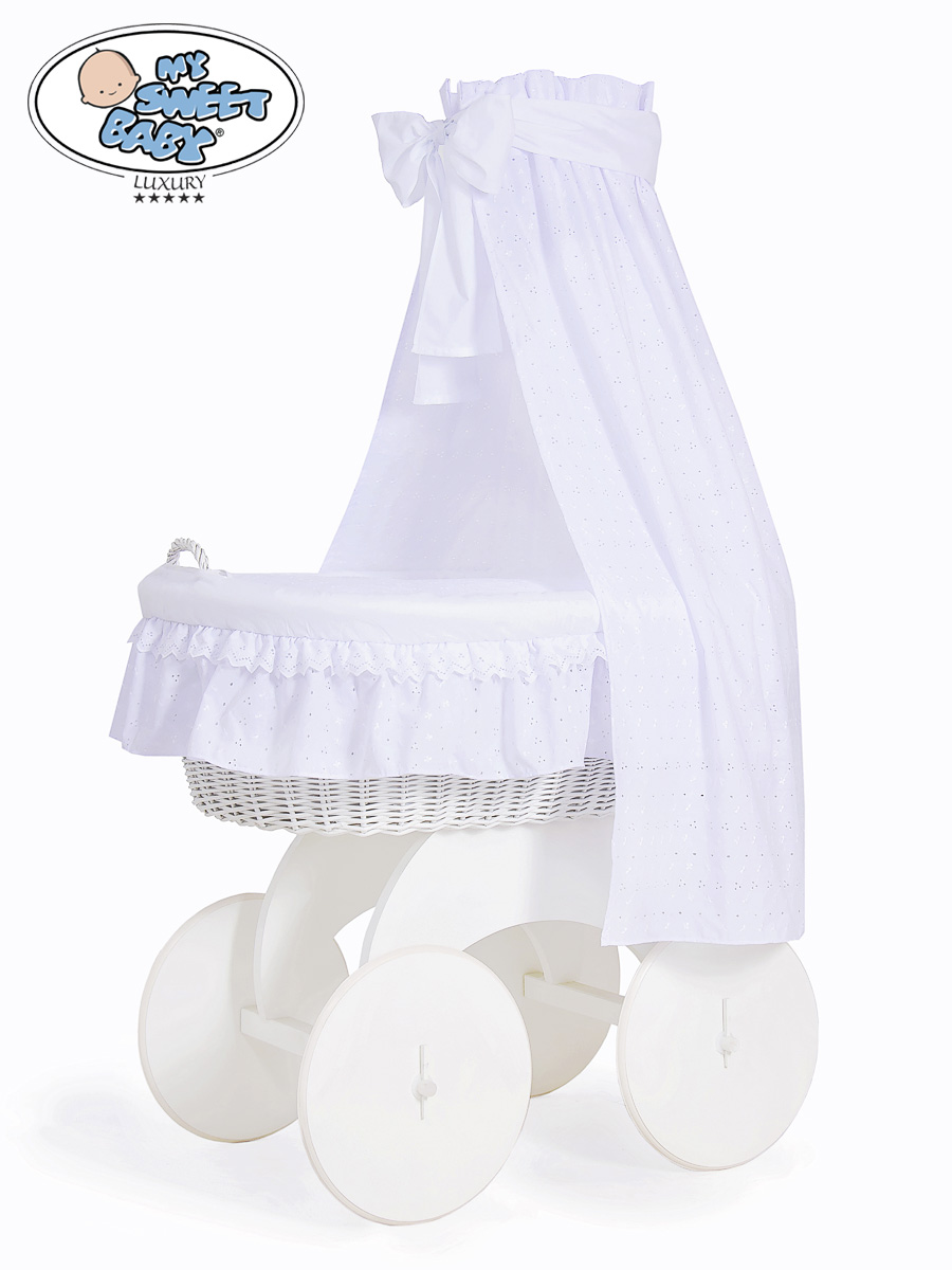 Baby Moses Basket on Wheels / Wicker drape crib Charlotte White Embroidered Bedding Set no 70202White Bedding Set A beautiful basket. The biggest bassinet on the market. A white color of wicker and wood.