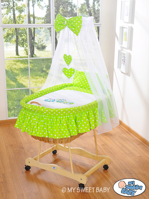 Baby Moses Basket on Wheels / Wicker drape crib- Owls green