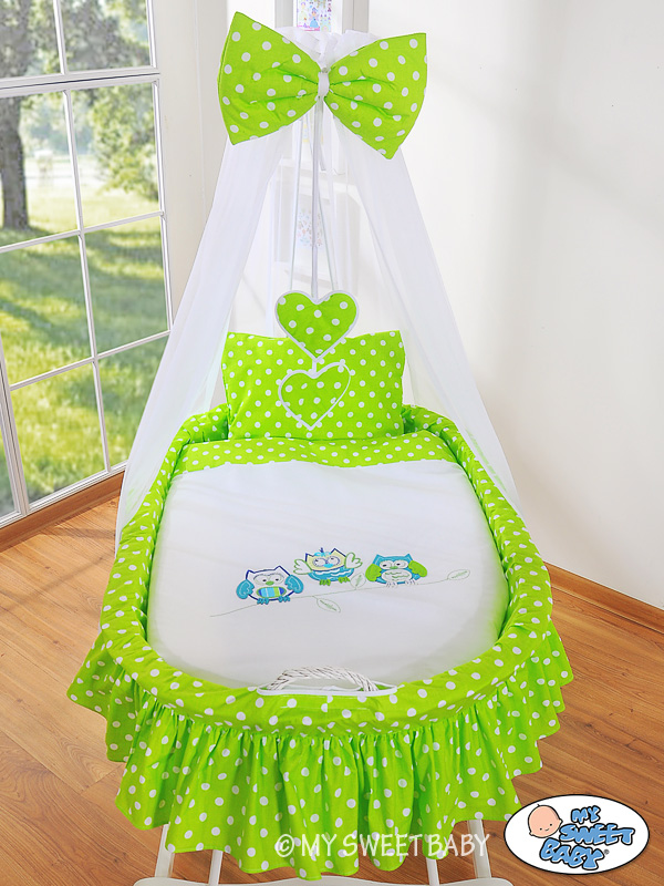Baby Moses Basket on Wheels / Wicker drape crib- Owls green