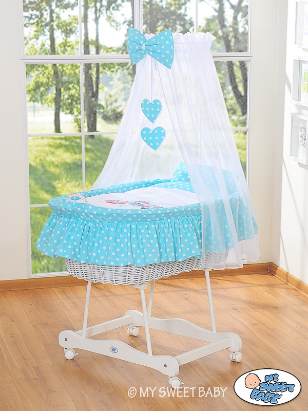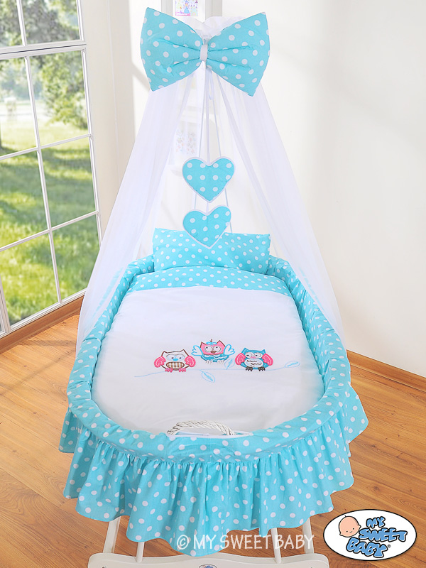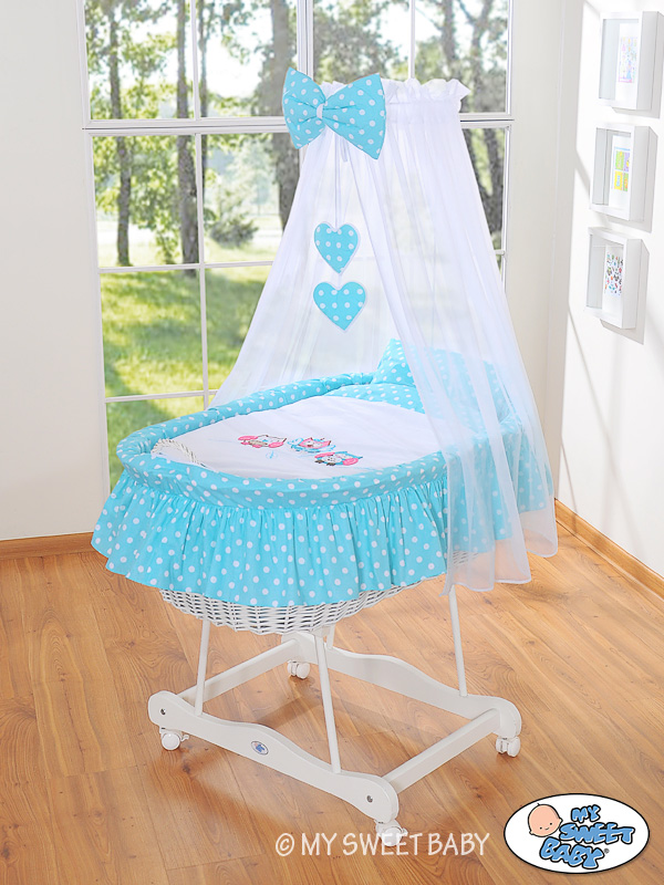 Baby Moses Basket on Wheels / Wicker drape crib- Owls turquoise