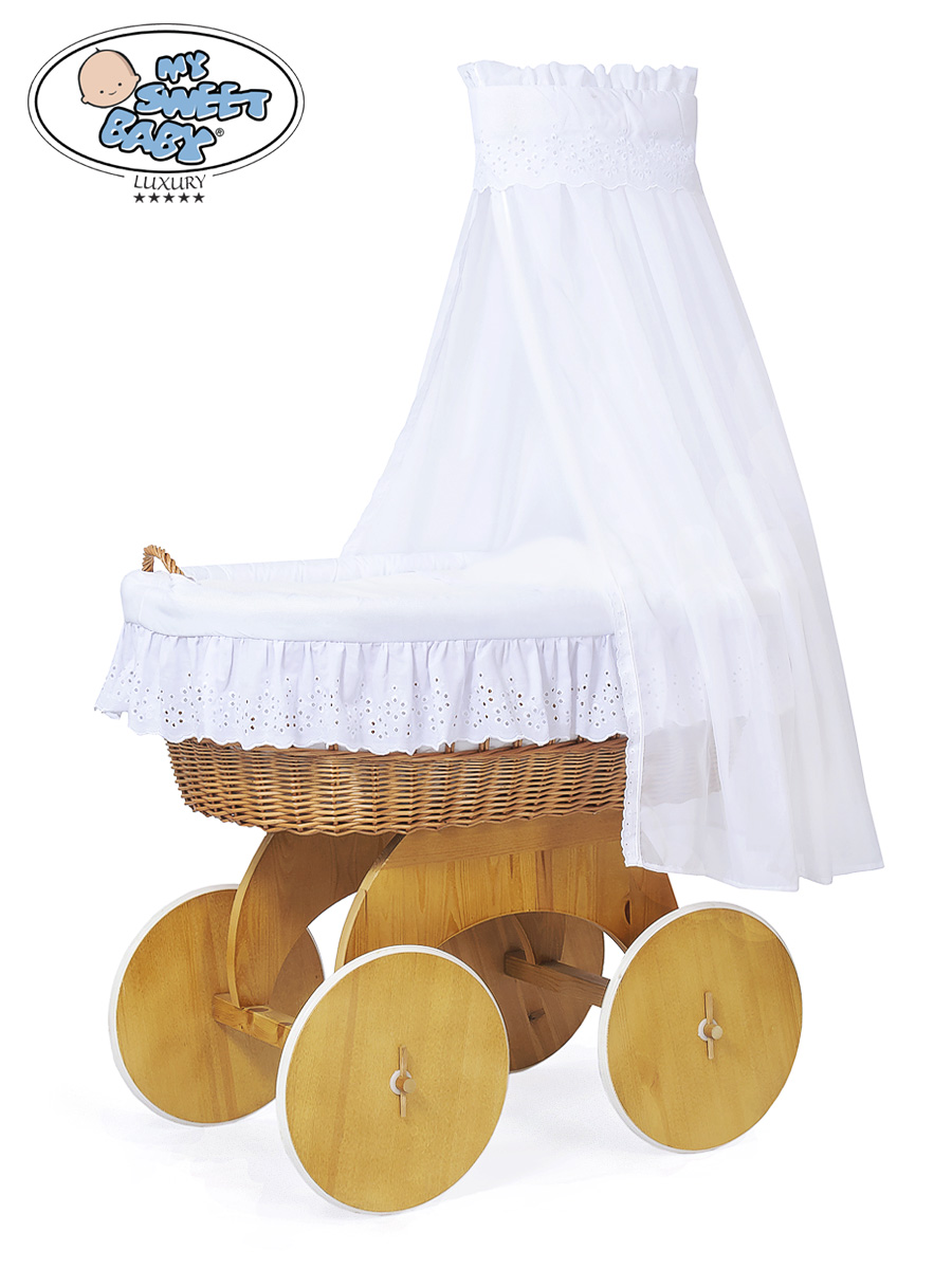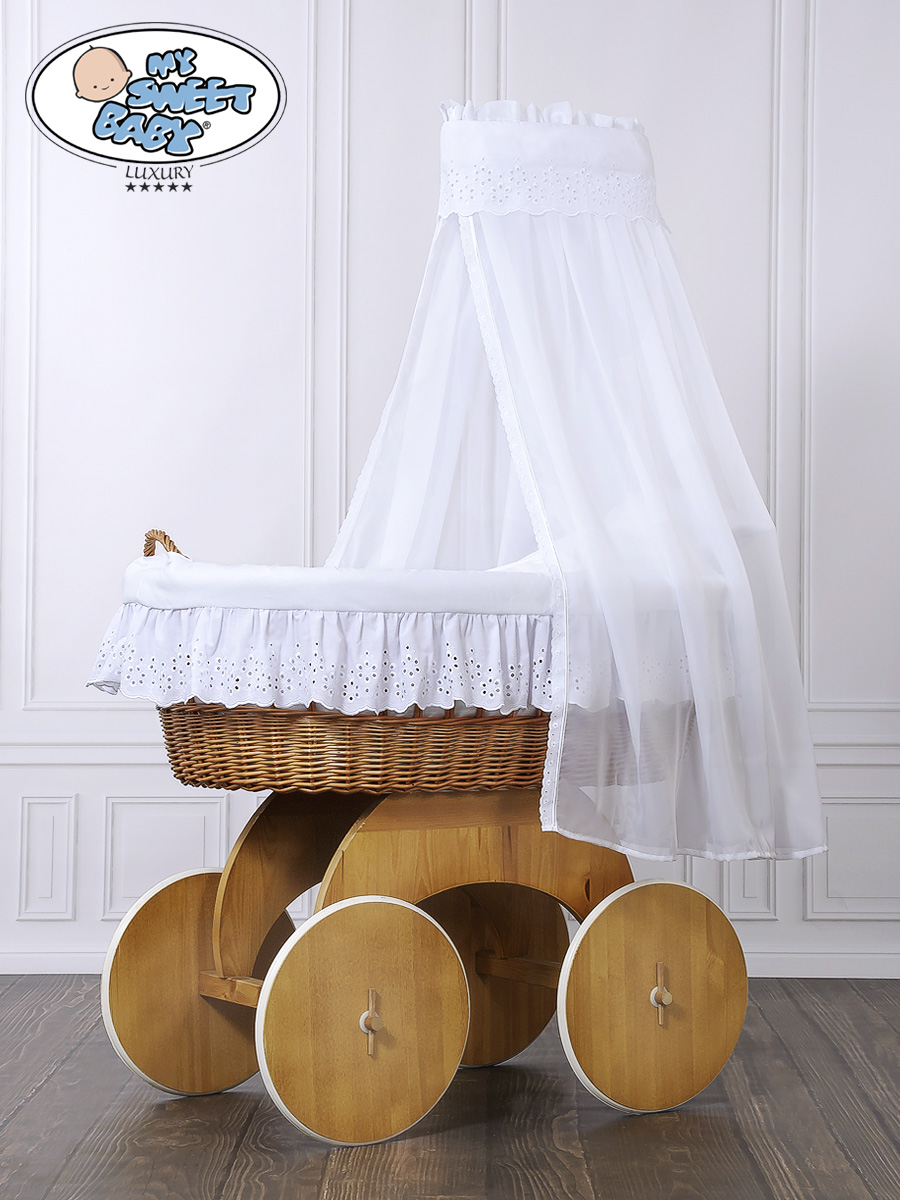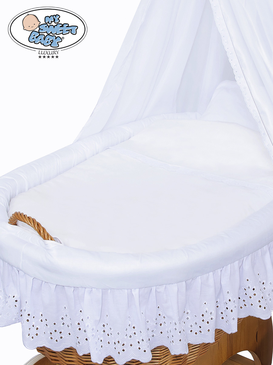 Baby Moses Basket on Wheels / Wicker drape crib Sophia White Bedding Set with White Embroidered Lace no 50202-912