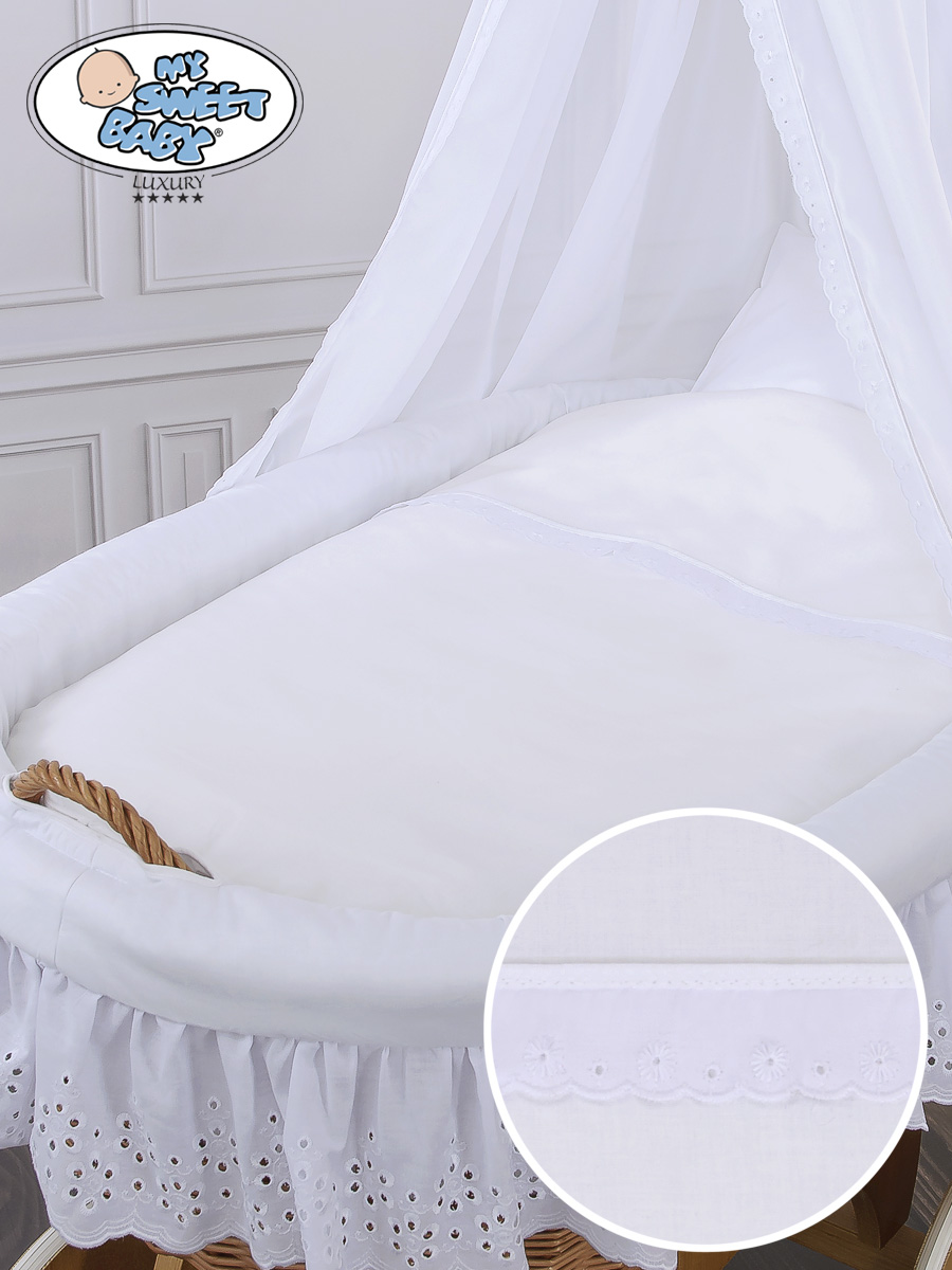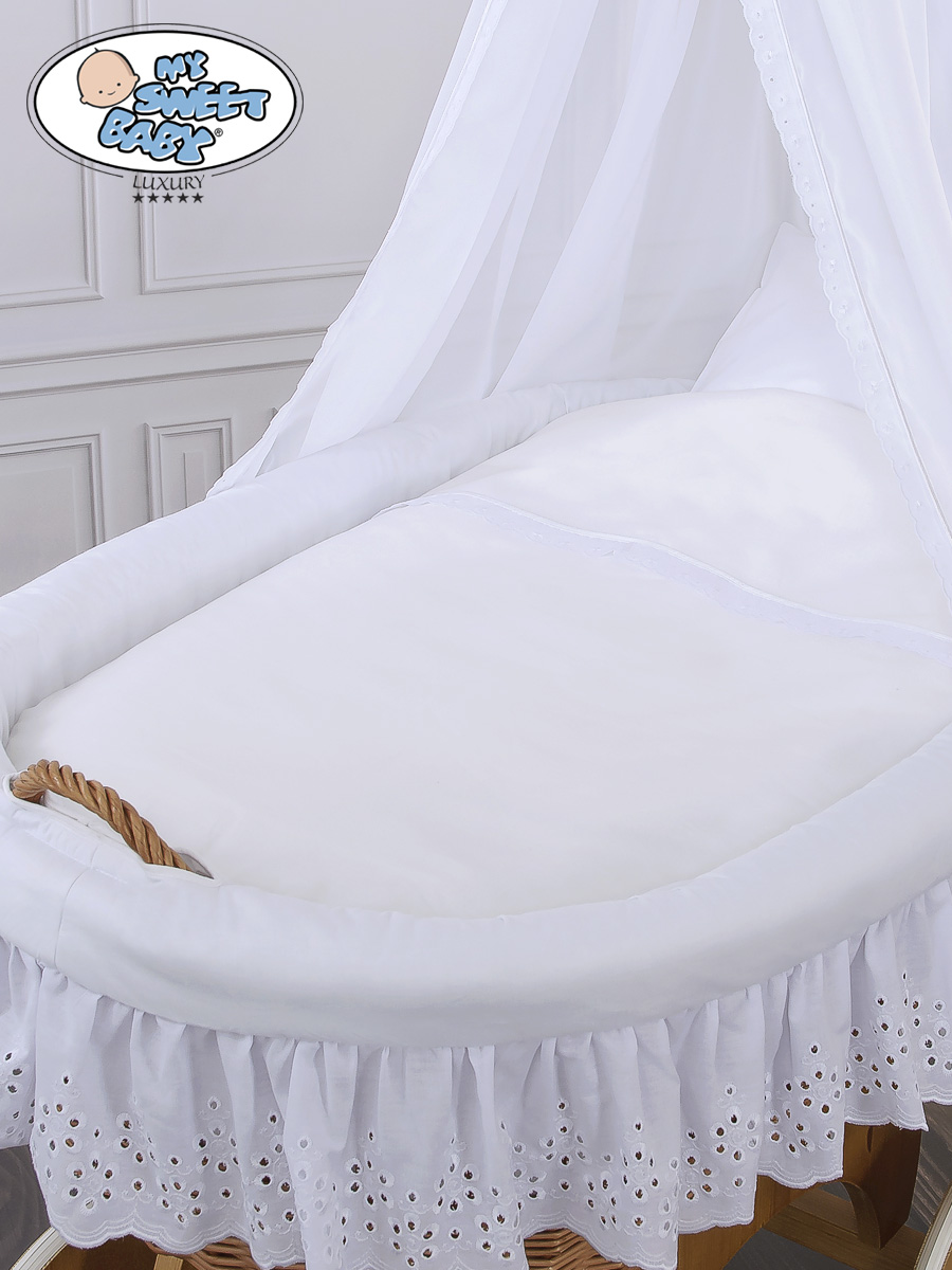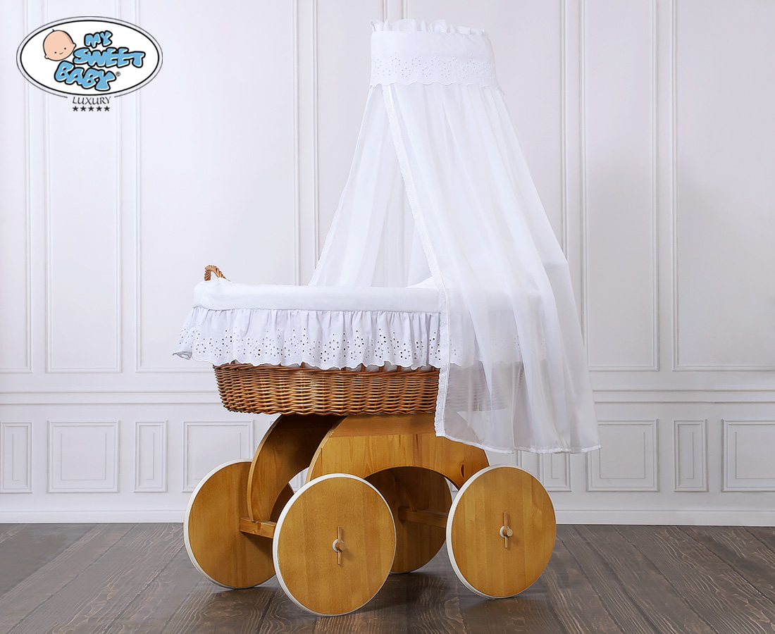 Baby Moses Basket on Wheels / Wicker drape crib Sophia White Bedding Set with White Embroidered Lace no 50202-912