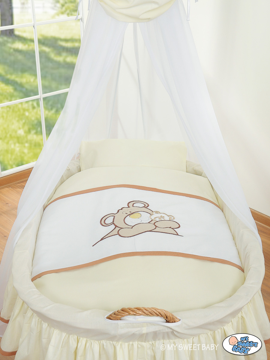 Cream Barnaba Bear Teddy Crib- Drape Wicker Wheels On Basket Moses Baby
