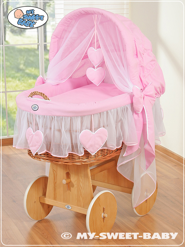 · The set includes complete bedding and hood cover as shown in the picture. - The biggest bassinet on the market with total sizing of L 98 cm, W 65 cm, H 130 cm. The biggest lying space: 80x45 cm allows to use the crib longer. Suitable from birth to 9 months approx. - Manually caned basket made of healthy, natural wicker. - The chassis made of real wood, very stable! Much higher than in other producers – 50 cm high. It brings comfort as bending down for the baby is not necessary. - Big wheels made of real wood (with the diameter of 30 cm) turn lightly and quietly. Each wheel has white rubber tyres that leave no marks on the floor. - All materials, from the wood for the chassis, through the wicker for the basket, to materials and the trim stuffing are precisely inspected and finished in detail. - The handle at the front of the bassinet allows to change its position easily. - Special hood mechanism allows to place the hood in every position. The mechanism is fixed to the basket, nevertheless, its elements may be easily disassembled to be take off the trim for washing. - Each basket is lined with a thick layer of fleece trimmed with cotton. It makes the basket a soft and comfortable nest your baby may sleep in. - A cotton pillow (35x37cm) and cover (78x78cm) are filled with special anti-allergic stuffing, very light and warm. The bed – clothing is 100% cotton. All elements may be mechanically washed. - The whole is easy - to –assemble, it’s enough to follow the assembly instruction. Just two moves and it’s ready! - Anti-allergic mattress, with a cover that may be taken off.