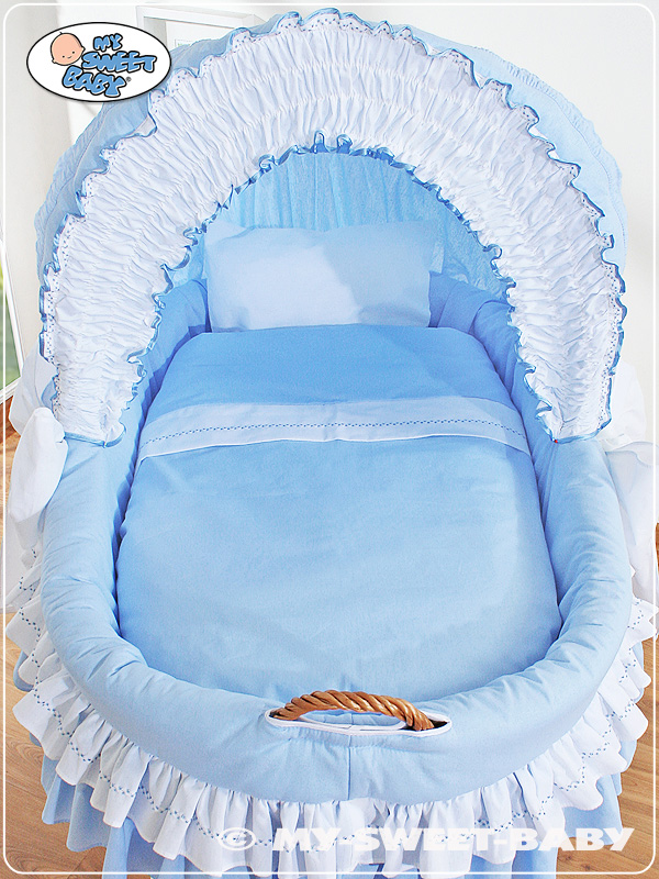 · The set includes complete bedding and hood cover as shown in the picture. - The biggest bassinet on the market with total sizing of L 98 cm, W 65 cm, H 130 cm. The biggest lying space: 80x45 cm allows to use the crib longer. Suitable from birth to 9 months approx. - Manually caned basket made of healthy, natural wicker. - The chassis made of real wood, very stable! Much higher than in other producers – 50 cm high. It brings comfort as bending down for the baby is not necessary. - Big wheels made of real wood (with the diameter of 30 cm) turn lightly and quietly. Each wheel has white rubber tyres that leave no marks on the floor. - All materials, from the wood for the chassis, through the wicker for the basket, to materials and the trim stuffing are precisely inspected and finished in detail. - The handle at the front of the bassinet allows to change its position easily. - Special hood mechanism allows to place the hood in every position. The mechanism is fixed to the basket, nevertheless, its elements may be easily disassembled to be take off the trim for washing. - Each basket is lined with a thick layer of fleece trimmed with cotton. It makes the basket a soft and comfortable nest your baby may sleep in. - A cotton pillow (35x37cm) and cover (78x78cm) are filled with special anti-allergic stuffing, very light and warm. The bed – clothing is 100% cotton. All elements may be mechanically washed. - The whole is easy - to –assemble, it’s enough to follow the assembly instruction. Just two moves and it’s ready! - Anti-allergic mattress, with a cover that may be taken off.