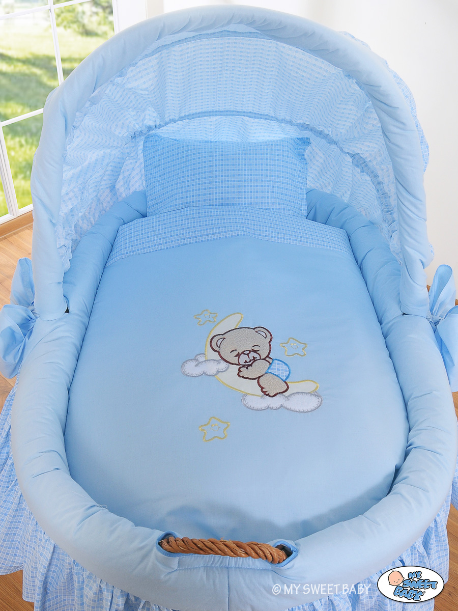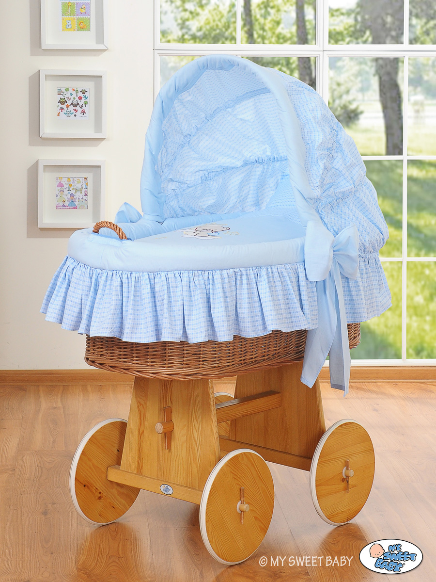 · The set includes complete bedding and hood cover as shown in the picture. - The biggest bassinet on the market with total sizing of L 98 cm, W 65 cm, H 130 cm. The biggest lying space: 80x45 cm allows to use the crib longer. Suitable from birth to 9 months approx. - Manually caned basket made of healthy, natural wicker. - The chassis made of real wood, very stable! Much higher than in other producers – 50 cm high. It brings comfort as bending down for the baby is not necessary. - Big wheels made of real wood (with the diameter of 30 cm) turn lightly and quietly. Each wheel has white rubber tyres that leave no marks on the floor. - All materials, from the wood for the chassis, through the wicker for the basket, to materials and the trim stuffing are precisely inspected and finished in detail. - The handle at the front of the bassinet allows to change its position easily. - Special hood mechanism allows to place the hood in every position. The mechanism is fixed to the basket, nevertheless, its elements may be easily disassembled to be take off the trim for washing. - Each basket is lined with a thick layer of fleece trimmed with cotton. It makes the basket a soft and comfortable nest your baby may sleep in. - A cotton pillow (35x37cm) and cover (78x78cm) are filled with special anti-allergic stuffing, very light and warm. The bed – clothing is 100% cotton. All elements may be mechanically washed. - The whole is easy - to –assemble, it’s enough to follow the assembly instruction. Just two moves and it’s ready! - Anti-allergic mattress, with a cover that may be taken off.