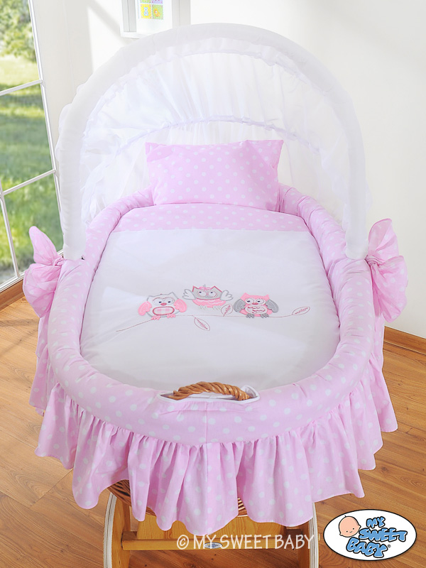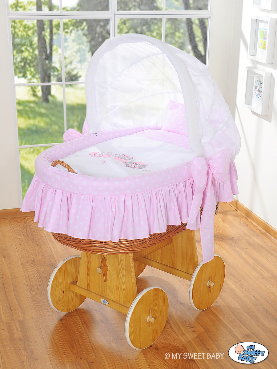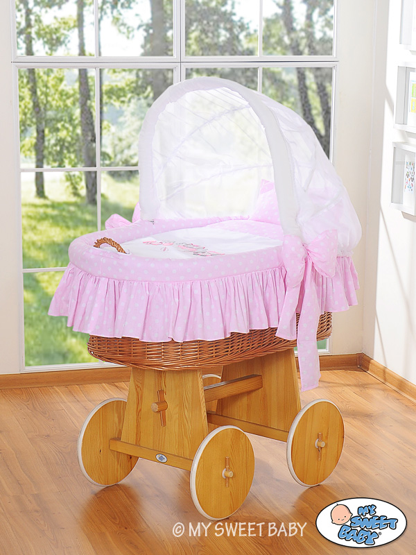 · The set includes complete bedding and drape set as shown in the picture. - The biggest bassinet on the market with total sizing of L 98 cm, W 65 cm, H 130 cm. The biggest lying space: 80x45 cm allows to use the crib longer. Suitable from birth to 9 months approx. - Manually caned basket made of healthy, natural wicker. - The chassis made of real wood, very stable! Much higher than in other producers – 50 cm high. It brings comfort as bending down for the baby is not necessary. - Big wheels made of real wood (with the diameter of 30 cm) turn lightly and quietly. Each wheel has white rubber tyres that leave no marks on the floor. - All materials, from the wood for the chassis, through the wicker for the basket, to materials and the trim stuffing are precisely inspected and finished in detail. - The handle at the front of the bassinet allows to change its position easily. - Special hood mechanism allows to place the hood in every position. The mechanism is fixed to the basket, nevertheless, its elements may be easily disassembled to be take off the trim for washing. - Each basket is lined with a thick layer of fleece trimmed with cotton. It makes the basket a soft and comfortable nest your baby may sleep in. - A cotton pillow (35x37cm) and cover (78x78cm) are filled with special anti-allergic stuffing, very light and warm. The bed – clothing is 100% cotton. All elements may be mechanically washed. - The whole is easy - to –assemble, it’s enough to follow the assembly instruction. Just two moves and it’s ready! - Anti-allergic mattress, with a cover that may be taken off.