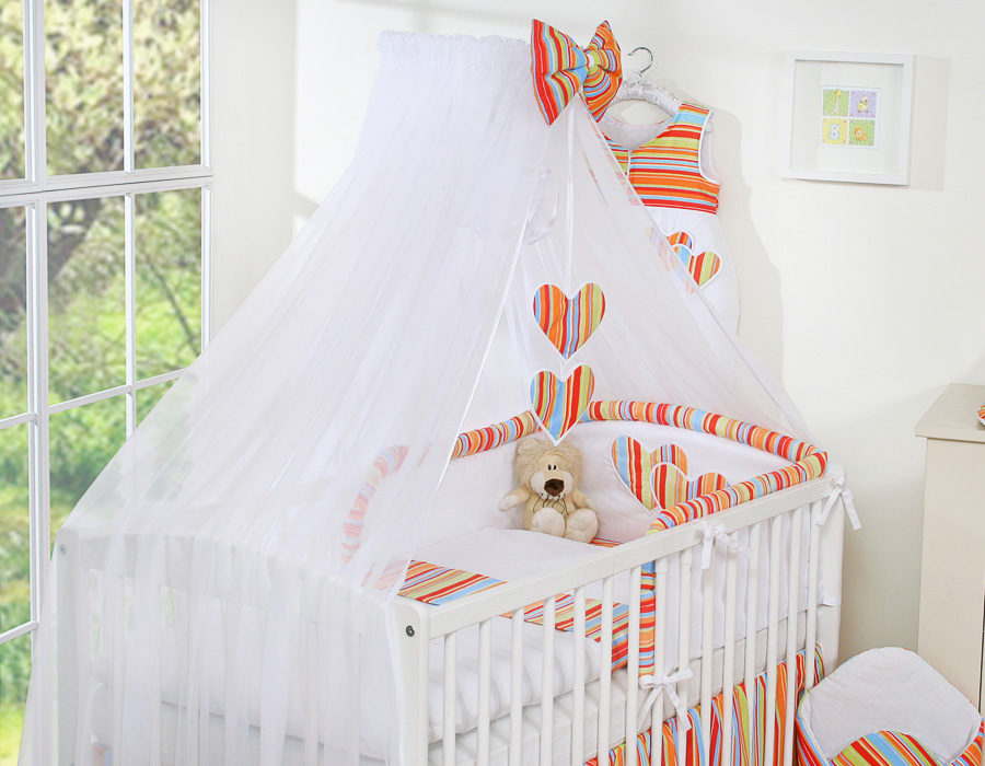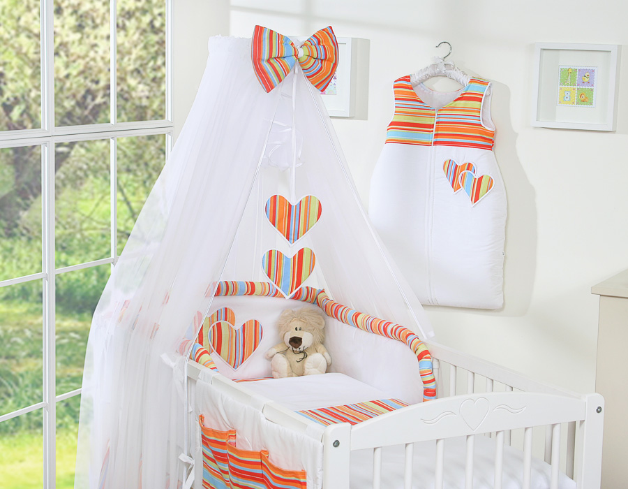 Babybed Bedding set 5-pcs with mosquito-net- Hanging Hearts orange stripes In the lovingly designed bedding it wonderful to sleep. Skin-friendly quality invites you to dream. Baby bedding set 5pcs with mosquito-net- Collection Hanging Hearts