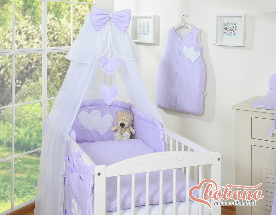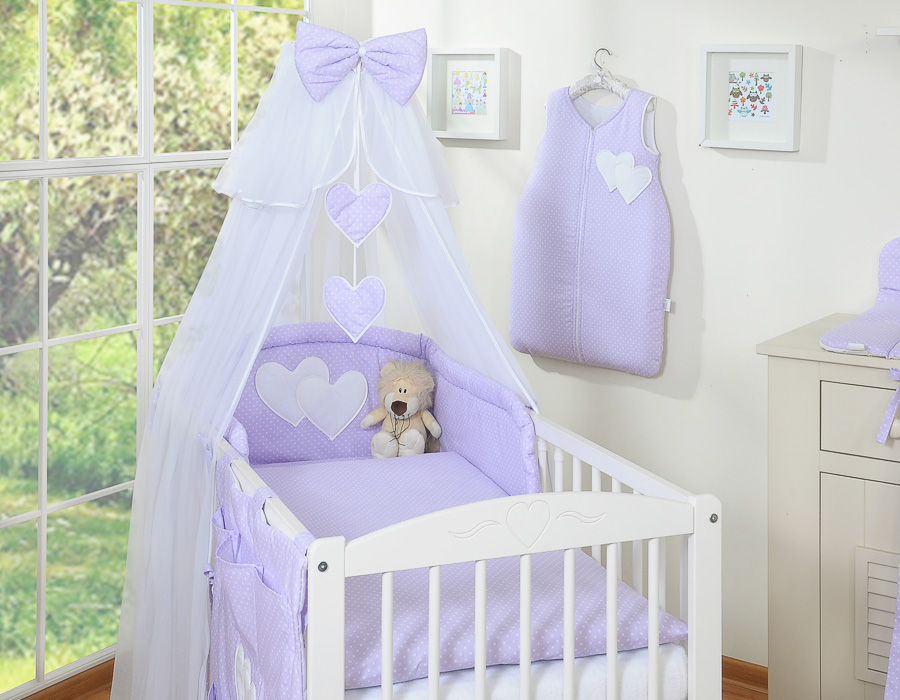 Babybed Bedding set 5-pcs with mosquito-net- Hanging Hearts white polka dots on lilac In the lovingly designed bedding it wonderful to sleep. Skin-friendly quality invites you to dream.