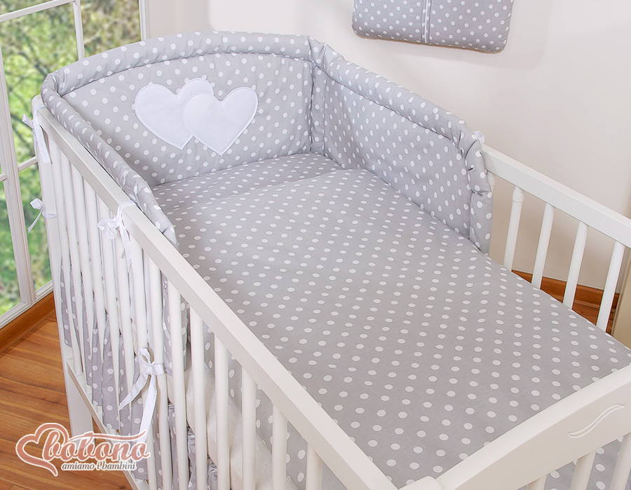 Dimensions: length 188 cm, height 35 cm. Specially designed with additional stitching. Perfectly fit for both size of cots: 60x120cm and 70x140cm. High headboard slightly rounded with decorative hearts, beautifully trimmed with satin piping. Specially trimmed, reinforced and thickened upper edge for greater softness and greater security in the cot.