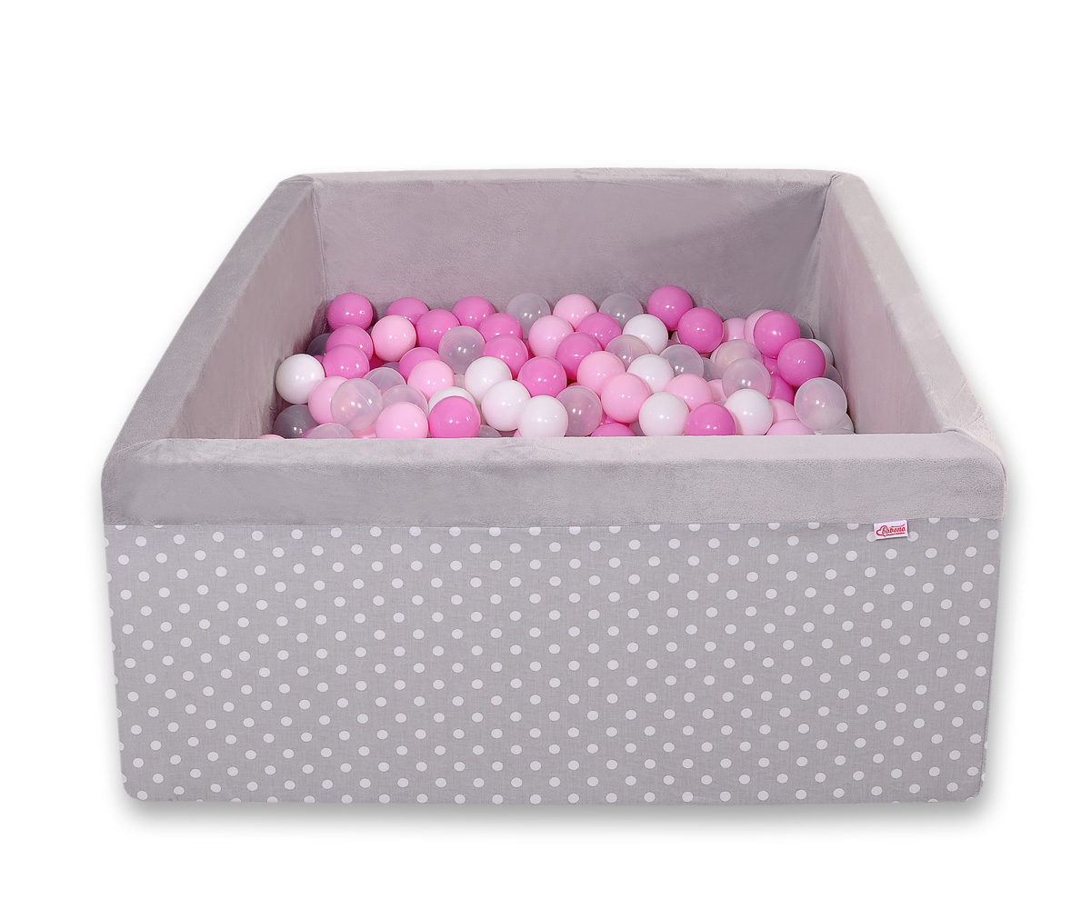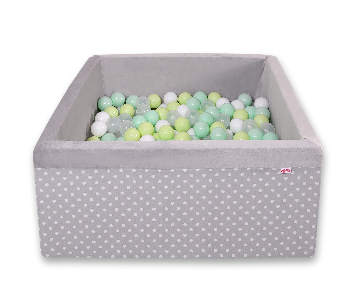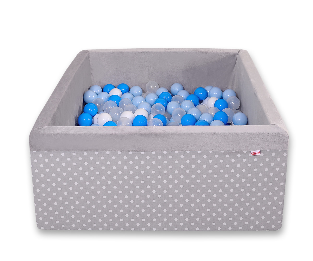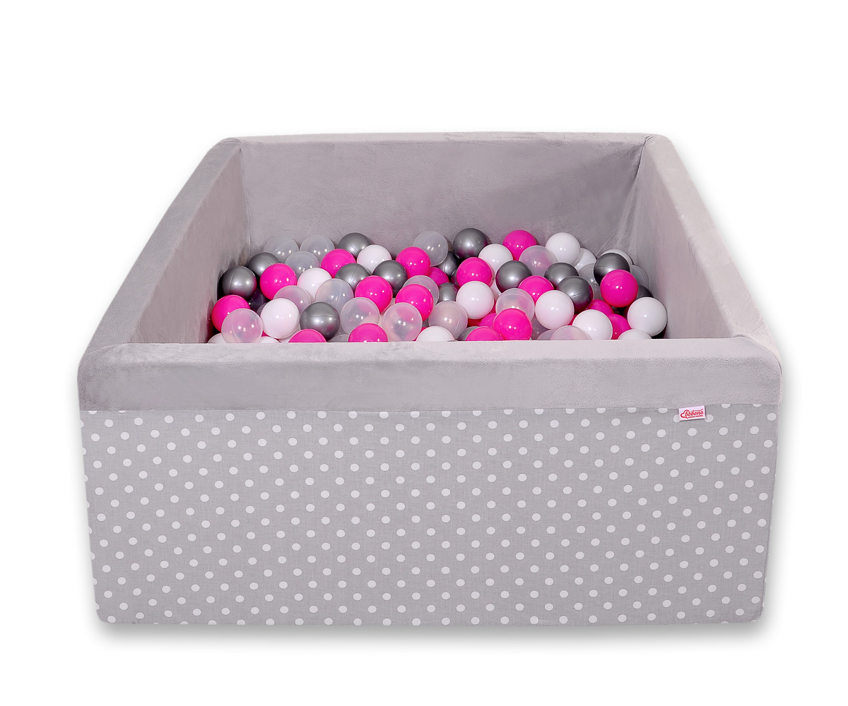 Ball-pit minky with balls 200pcs - white dots on Gray Ball pit suitable for playing both at home and in the open air. It is ideal not only for fun but it provides comfort, stimulation and helps develop hand eye coordination and it is positive for the child's development.