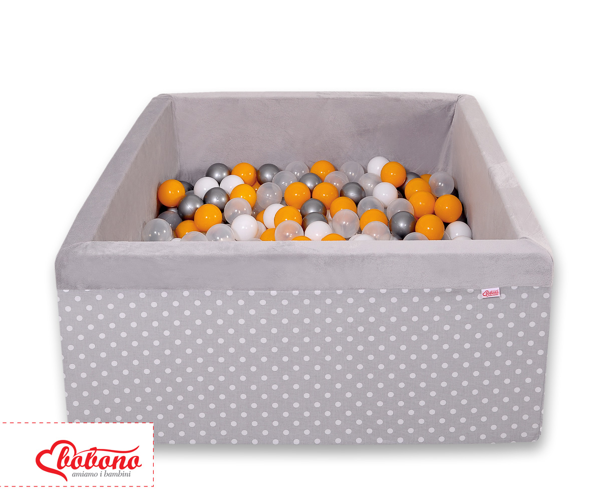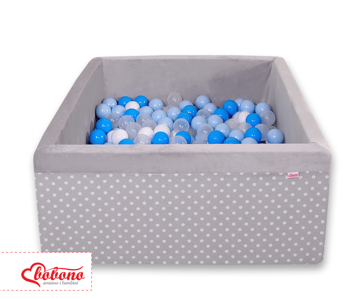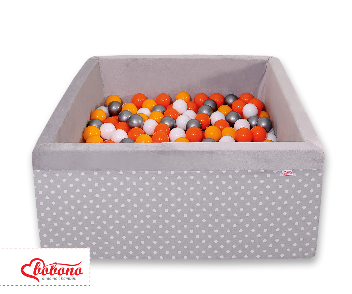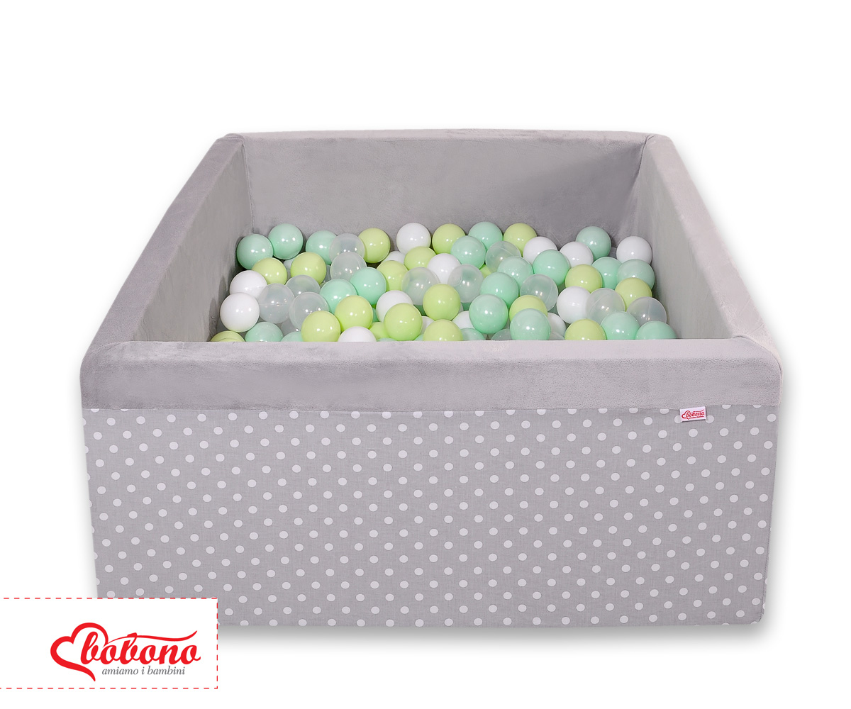 Ball-pit minky with balls 200pcs - white dots on Gray Ball pit suitable for playing both at home and in the open air. It is ideal not only for fun but it provides comfort, stimulation and helps develop hand eye coordination and it is positive for the child's development.
