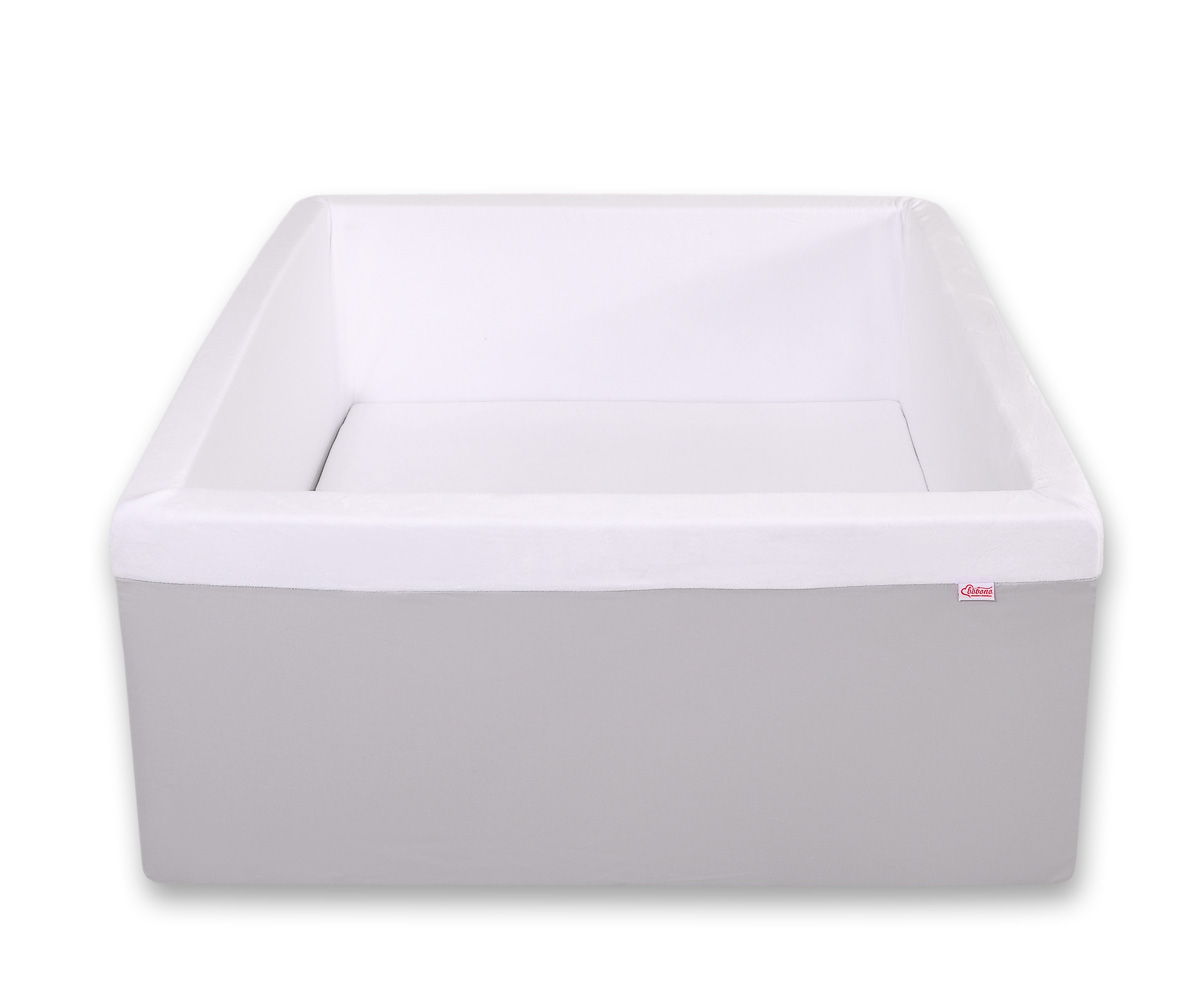 The pool is square. Inside dimensions approx. 80 x 80 cm, outside dimensions approx. 90 x 90 cm. Height approx. 40 cm. Made of soft foam. Removable, zippered cover made of 100% cotton and soft minky fleece.