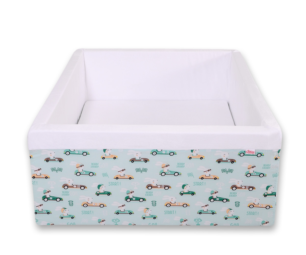 The pool is square. Inside dimensions approx. 80 x 80 cm, outside dimensions approx. 90 x 90 cm. Height approx. 40 cm. Made of soft foam. Removable, zippered cover made of 100% cotton and soft minky fleece.