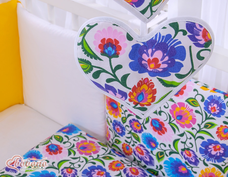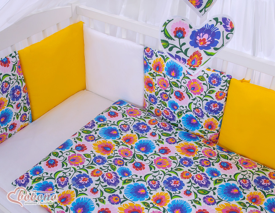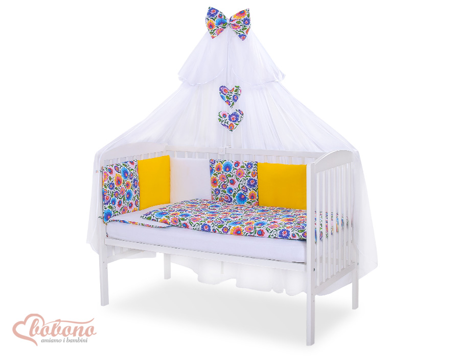 The 11-pcs set includes: 1. Double-sided pillow cover 40x60 cm (fabric 100% Cotton) 2. Double-sided duvet cover 90x120cm or 100x135cm (fabric 100% Cotton) 3-8. Universal bumper 6pcs- the bumper is made of 6 pillows filled with a special non-allergic and breathable silicone Filling (certified OKOTEX). The size of one pillow is 32cm x 32cm. Cover of the bumper or made of 100% cotton. Pillows have fastening strips to match them each other. You can match the pillows in any order. It is a perfect decoration of baby cot. If we match every pillows together the bumper can be used as a playing mat for baby. 9. Mosquito-net made of Chiffon (470x160cm) 10. Bow+ 11. Hanging applications.