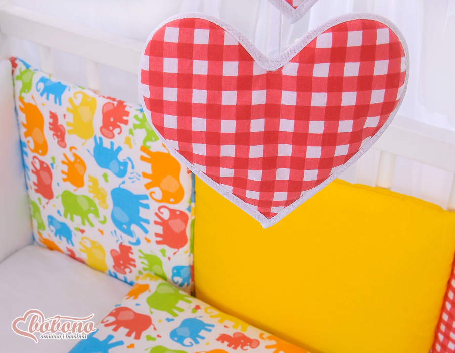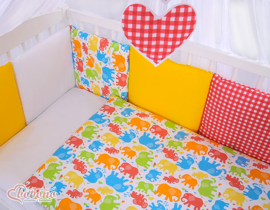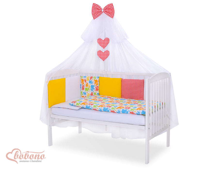 The 11-pcs set includes: 1. Double-sided pillow cover 40x60 cm (fabric 100% Cotton) 2. Double-sided duvet cover 90x120cm or 100x135cm (fabric 100% Cotton) 3-8. Universal bumper 6pcs- the bumper is made of 6 pillows filled with a special non-allergic and breathable silicone Filling (certified OKOTEX). The size of one pillow is 32cm x 32cm. Cover of the bumper or made of 100% cotton. Pillows have fastening strips to match them each other. You can match the pillows in any order. It is a perfect decoration of baby cot. If we match every pillows together the bumper can be used as a playing mat for baby. 9. Mosquito-net made of Chiffon (470x160cm) 10. Bow+ 11. Hanging applications.