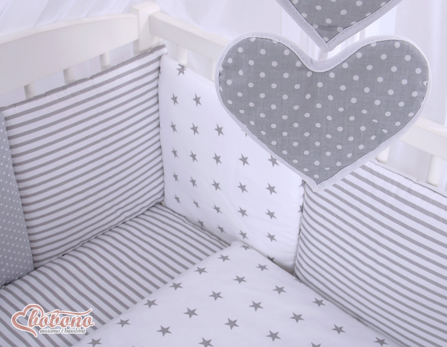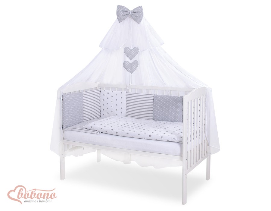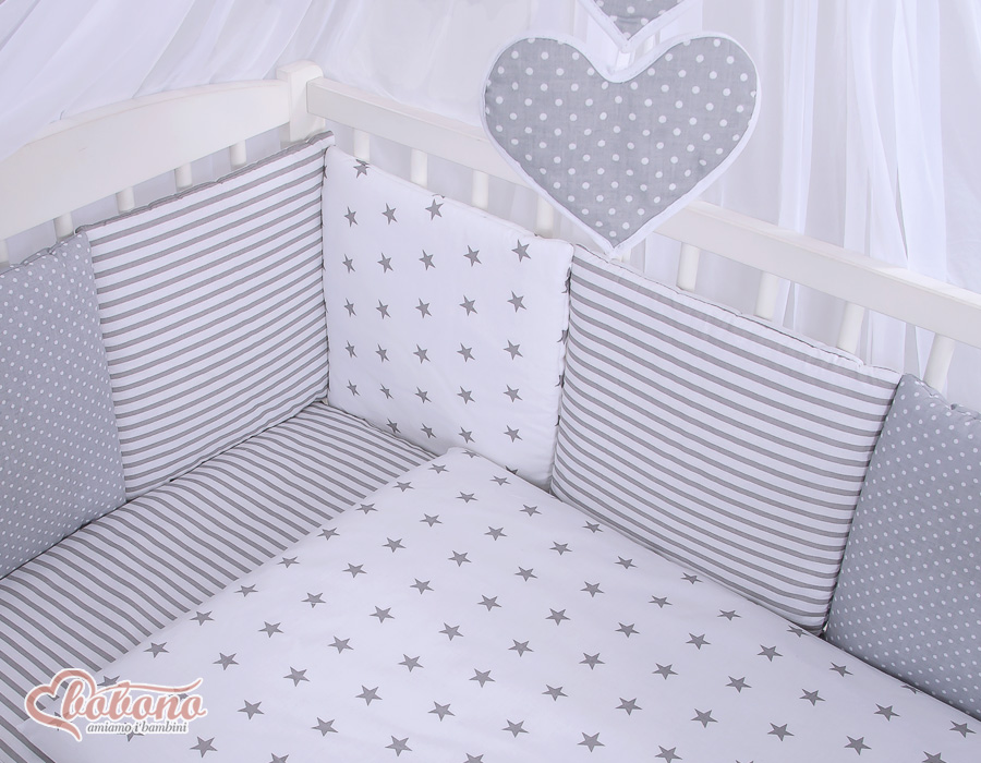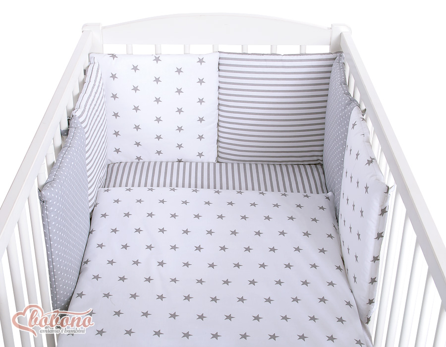 The 11-pcs set includes: 1. Double-sided pillow cover 40x60 cm (fabric 100% Cotton) 2. Double-sided duvet cover 90x120cm or 100x135cm (fabric 100% Cotton) 3-8. Universal bumper 6pcs- the bumper is made of 6 pillows filled with a special non-allergic and breathable silicone Filling (certified OKOTEX). The size of one pillow is 32cm x 32cm. Cover of the bumper or made of 100% cotton. Pillows have fastening strips to match them each other. You can match the pillows in any order. It is a perfect decoration of baby cot. If we match every pillows together the bumper can be used as a playing mat for baby. 9. Mosquito-net made of Chiffon (470x160cm) 10. Bow+ 11. Hanging applications.
