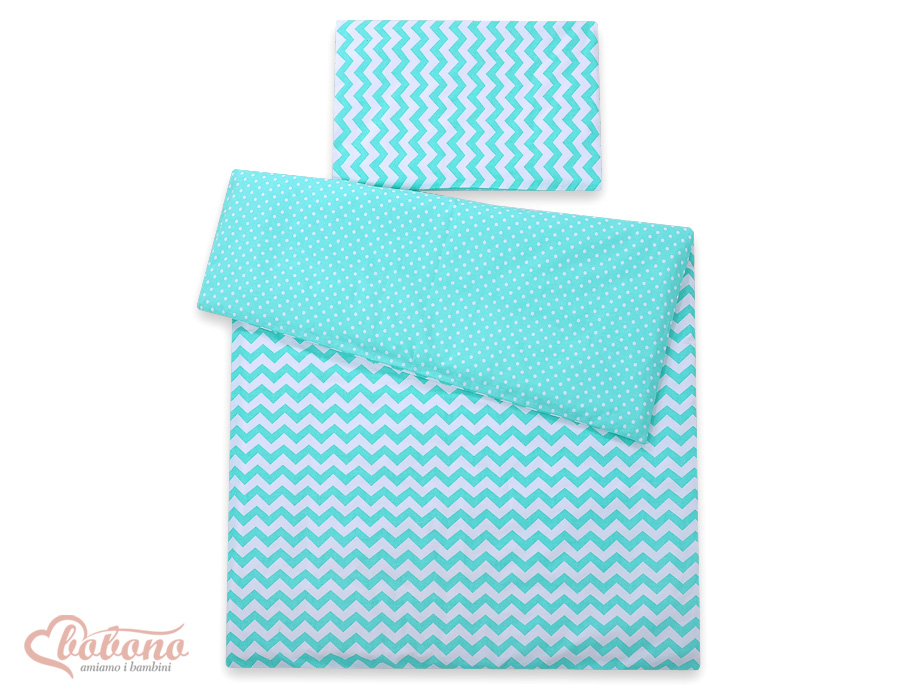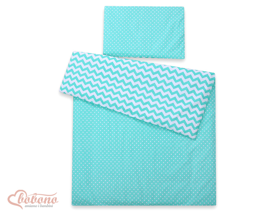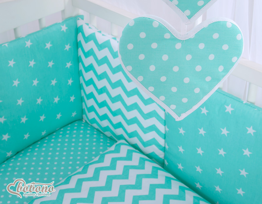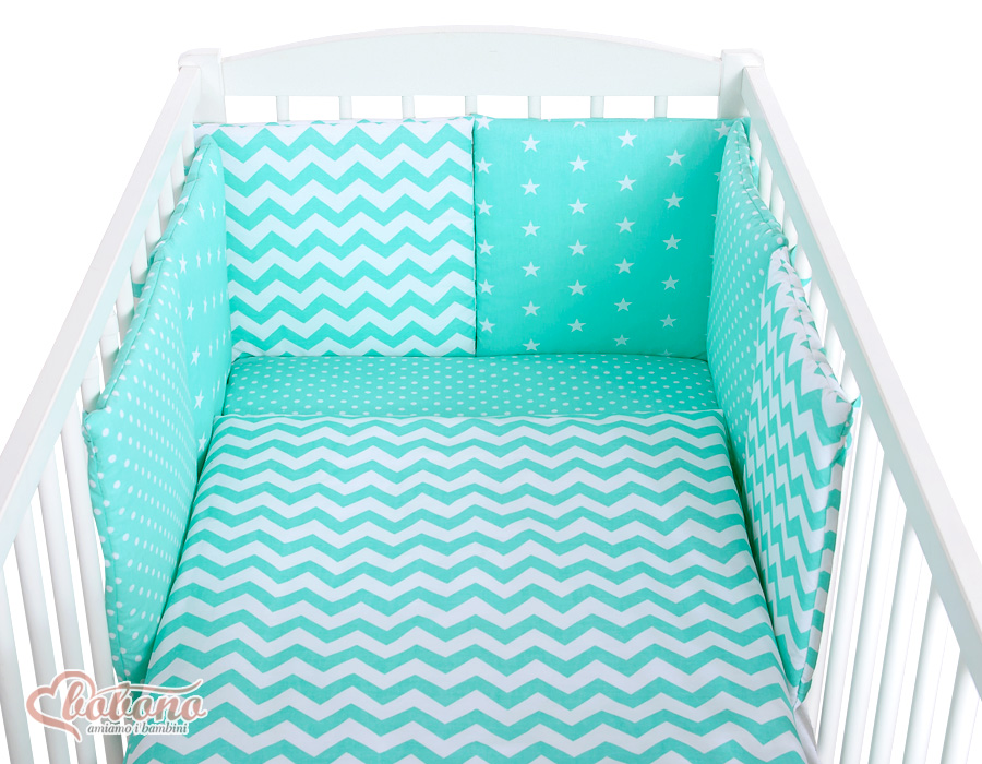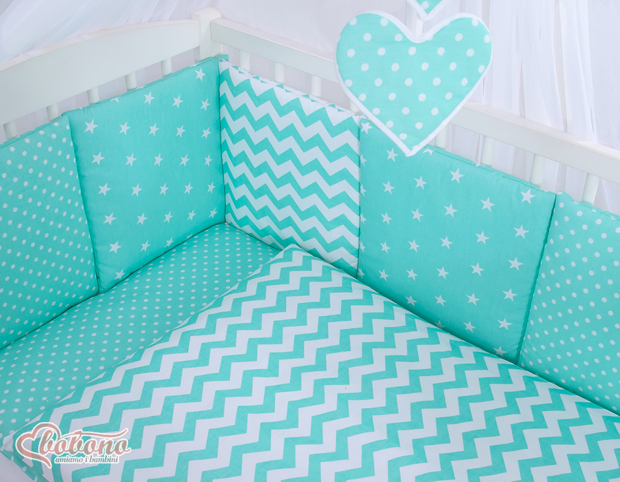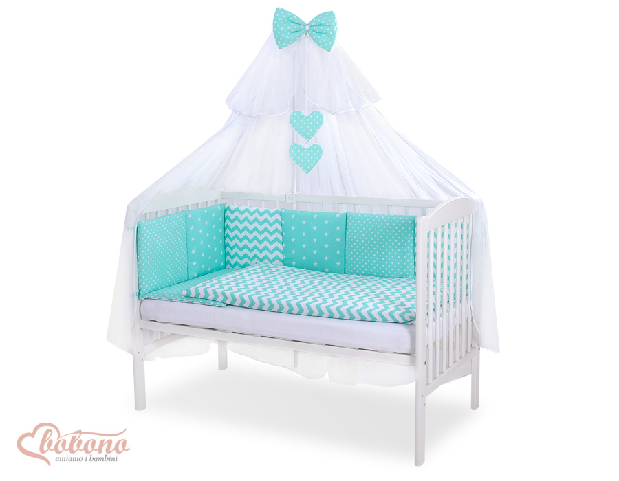 The 11-pcs set includes: 1. Double-sided pillow cover 40x60 cm (fabric 100% Cotton) 2. Double-sided duvet cover 90x120cm or 100x135cm (fabric 100% Cotton) 3-8. Universal bumper 6pcs- the bumper is made of 6 pillows filled with a special non-allergic and breathable silicone Filling (certified OKOTEX). The size of one pillow is 32cm x 32cm. Cover of the bumper or made of 100% cotton. Pillows have fastening strips to match them each other. You can match the pillows in any order. It is a perfect decoration of baby cot. If we match every pillows together the bumper can be used as a playing mat for baby. 9. Mosquito-net made of Chiffon (470x160cm) 10. Bow+ 11. Hanging applications.