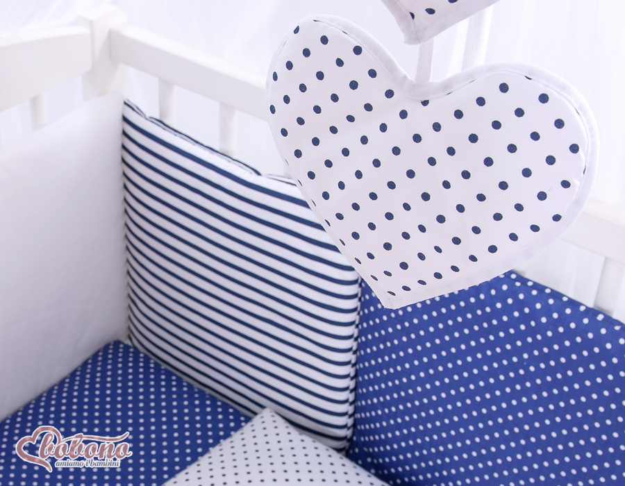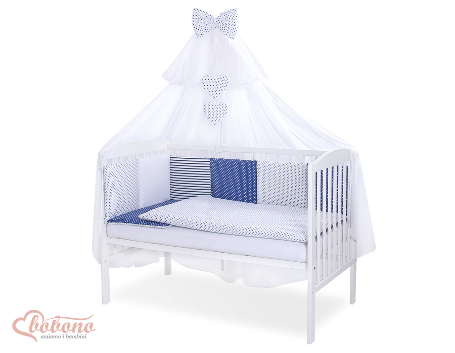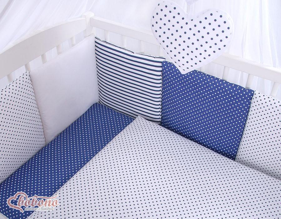The 11-pcs set includes: 1. Double-sided pillow cover 40x60 cm (fabric 100% Cotton) 2. Double-sided duvet cover 90x120cm or 100x135cm (fabric 100% Cotton) 3-8. Universal bumper 6pcs- the bumper is made of 6 pillows filled with a special non-allergic and breathable silicone Filling (certified OKOTEX). The size of one pillow is 32cm x 32cm. Cover of the bumper or made of 100% cotton. Pillows have fastening strips to match them each other. You can match the pillows in any order. It is a perfect decoration of baby cot. If we match every pillows together the bumper can be used as a playing mat for baby. 9. Mosquito-net made of Chiffon (470x160cm) 10. Bow+ 11. Hanging applications.