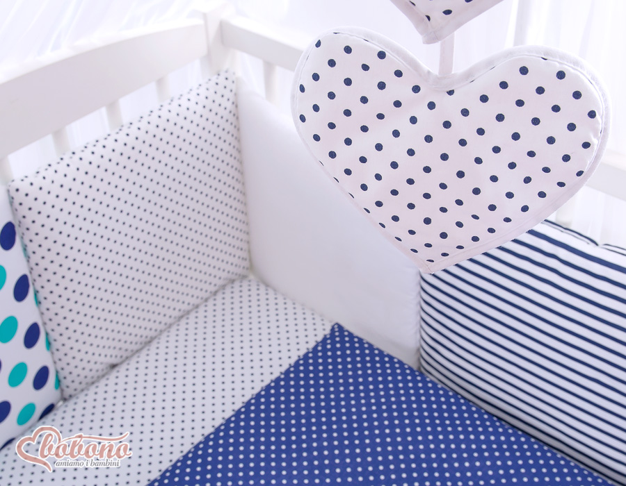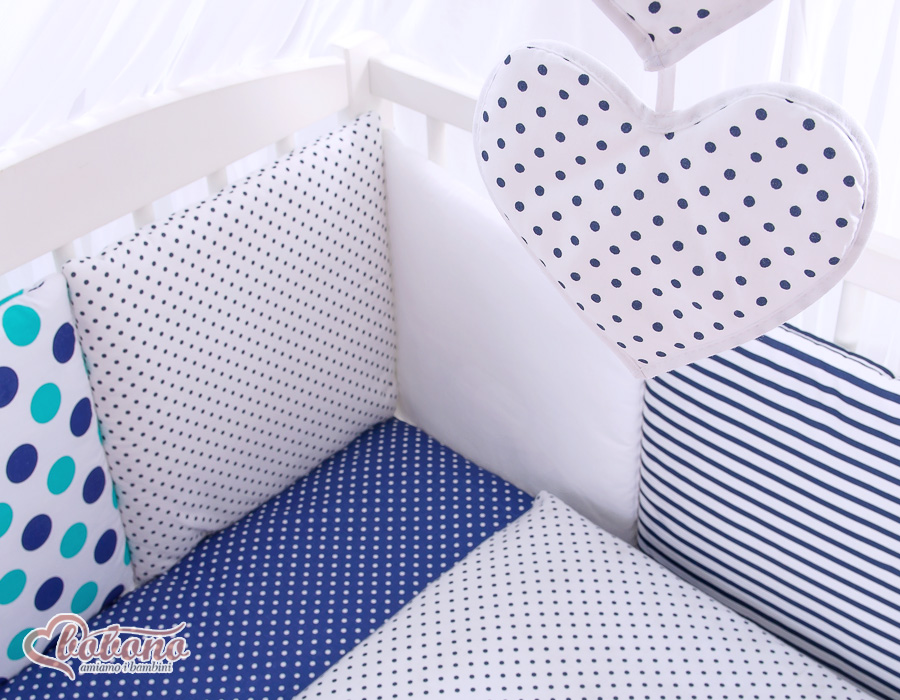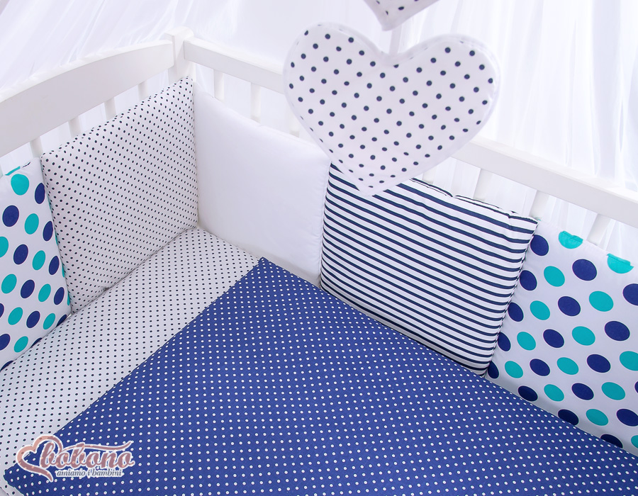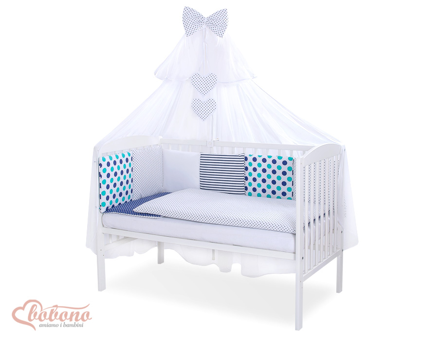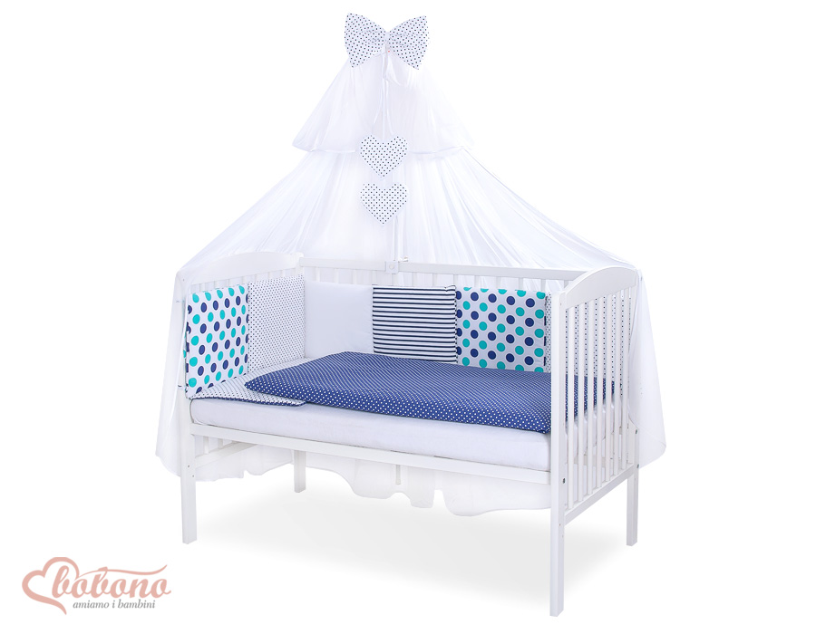 The 11-pcs set includes: 1. Double-sided pillow cover 40x60 cm (fabric 100% Cotton) 2. Double-sided duvet cover 90x120cm or 100x135cm (fabric 100% Cotton) 3-8. Universal bumper 6pcs- the bumper is made of 6 pillows filled with a special non-allergic and breathable silicone Filling (certified OKOTEX). The size of one pillow is 32cm x 32cm. Cover of the bumper or made of 100% cotton. Pillows have fastening strips to match them each other. You can match the pillows in any order. It is a perfect decoration of baby cot. If we match every pillows together the bumper can be used as a playing mat for baby. 9. Mosquito-net made of Chiffon (470x160cm) 10. Bow+ 11. Hanging applications.