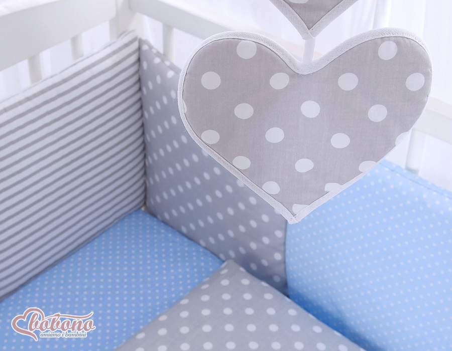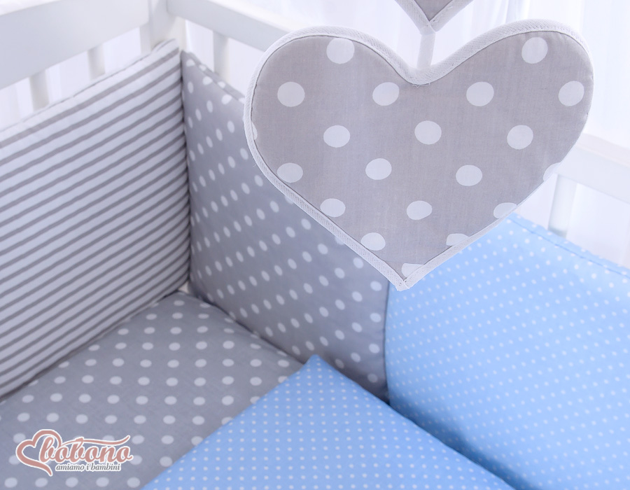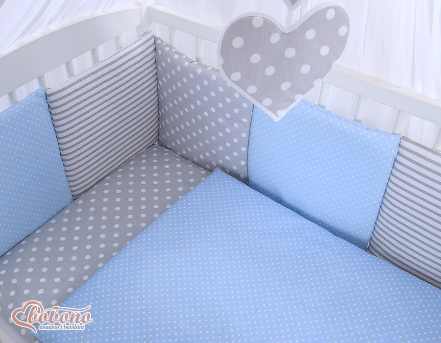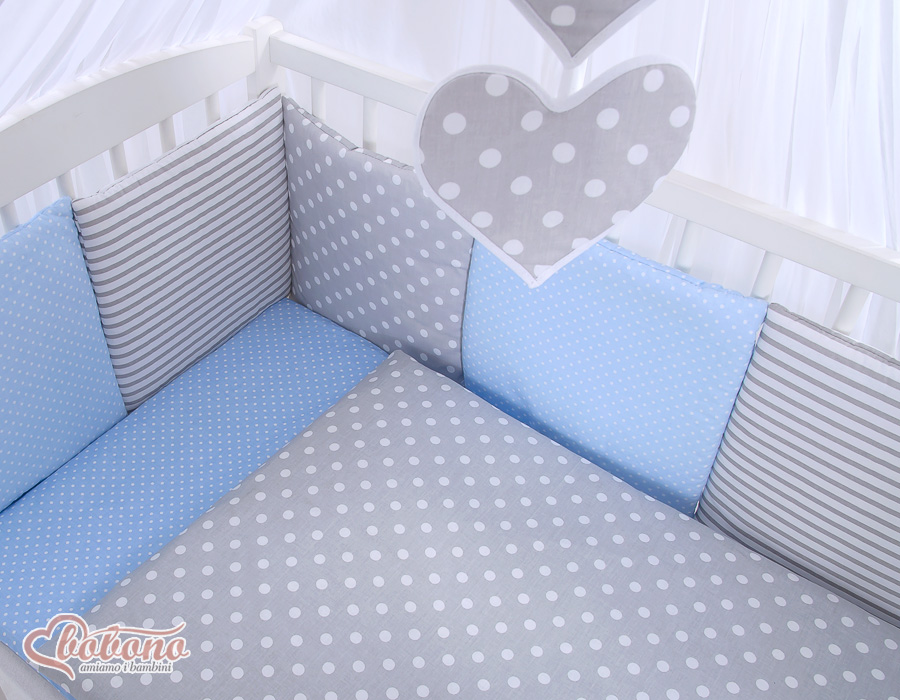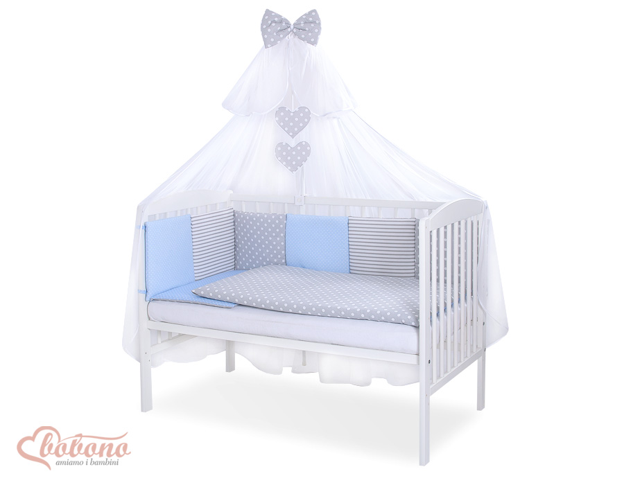 The 11-pcs set includes: 1. Double-sided pillow cover 40x60 cm (fabric 100% Cotton) 2. Double-sided duvet cover 90x120cm or 100x135cm (fabric 100% Cotton) 3-8. Universal bumper 6pcs- the bumper is made of 6 pillows filled with a special non-allergic and breathable silicone Filling (certified OKOTEX). The size of one pillow is 32cm x 32cm. Cover of the bumper or made of 100% cotton. Pillows have fastening strips to match them each other. You can match the pillows in any order. It is a perfect decoration of baby cot. If we match every pillows together the bumper can be used as a playing mat for baby. 9. Mosquito-net made of Chiffon (470x160cm) 10. Bow+ 11. Hanging applications.