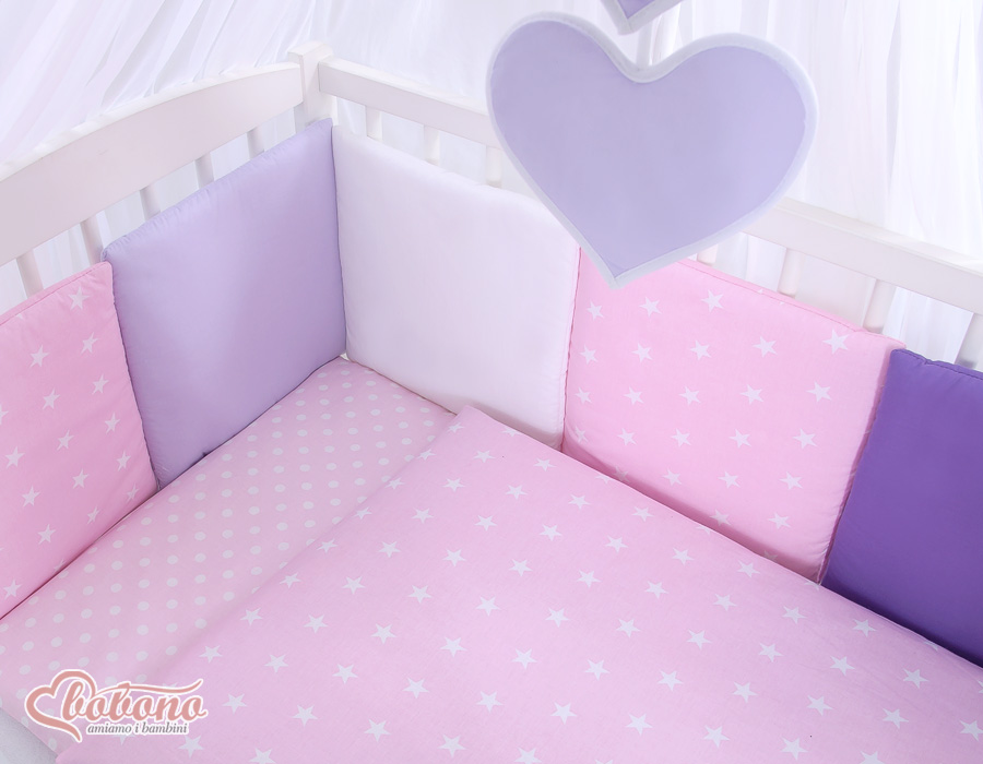 The 11-pcs set includes: 1. Double-sided pillow cover 40x60 cm (fabric 100% Cotton) 2. Double-sided duvet cover 90x120cm or 100x135cm (fabric 100% Cotton) 3-8. Universal bumper 6pcs- the bumper is made of 6 pillows filled with a special non-allergic and breathable silicone Filling (certified OKOTEX). The size of one pillow is 32cm x 32cm. Cover of the bumper or made of 100% cotton. Pillows have fastening strips to match them each other. You can match the pillows in any order. It is a perfect decoration of baby cot. If we match every pillows together the bumper can be used as a playing mat for baby. 9. Mosquito-net made of Chiffon (470x160cm) 10. Bow+ 11. Hanging applications.
