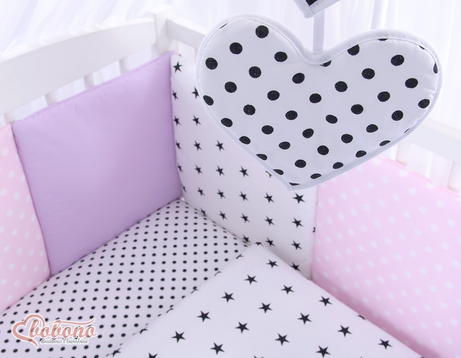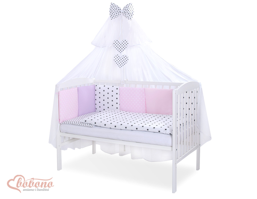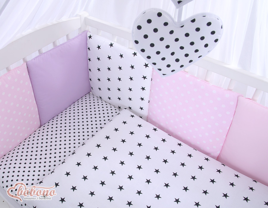 The 11-pcs set includes: 1. Double-sided pillow cover 40x60 cm (fabric 100% Cotton) 2. Double-sided duvet cover 90x120cm or 100x135cm (fabric 100% Cotton) 3-8. Universal bumper 6pcs- the bumper is made of 6 pillows filled with a special non-allergic and breathable silicone Filling (certified OKOTEX). The size of one pillow is 32cm x 32cm. Cover of the bumper or made of 100% cotton. Pillows have fastening strips to match them each other. You can match the pillows in any order. It is a perfect decoration of baby cot. If we match every pillows together the bumper can be used as a playing mat for baby. 9. Mosquito-net made of Chiffon (470x160cm) 10. Bow+ 11. Hanging applications.