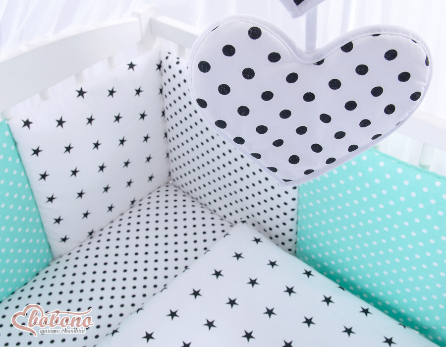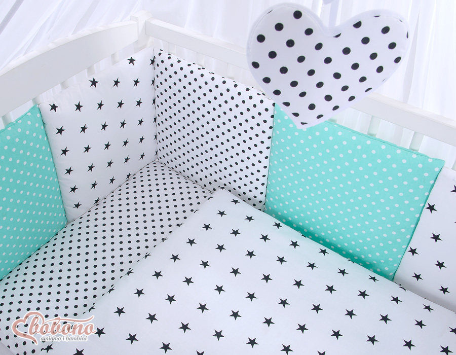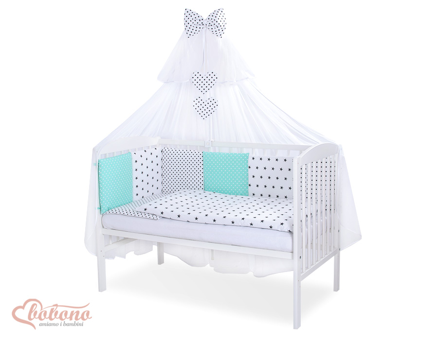 The 11-pcs set includes: 1. Double-sided pillow cover 40x60 cm (fabric 100% Cotton) 2. Double-sided duvet cover 90x120cm or 100x135cm (fabric 100% Cotton) 3-8. Universal bumper 6pcs- the bumper is made of 6 pillows filled with a special non-allergic and breathable silicone Filling (certified OKOTEX). The size of one pillow is 32cm x 32cm. Cover of the bumper or made of 100% cotton. Pillows have fastening strips to match them each other. You can match the pillows in any order. It is a perfect decoration of baby cot. If we match every pillows together the bumper can be used as a playing mat for baby. 9. Mosquito-net made of Chiffon (470x160cm) 10. Bow+ 11. Hanging applications.