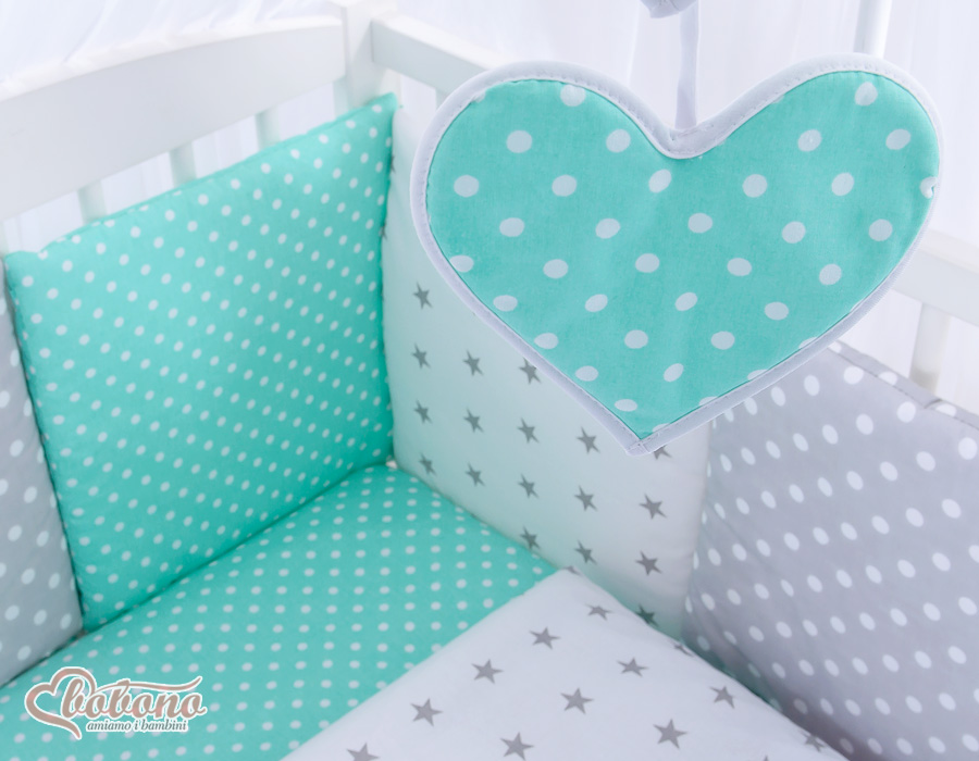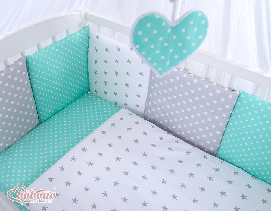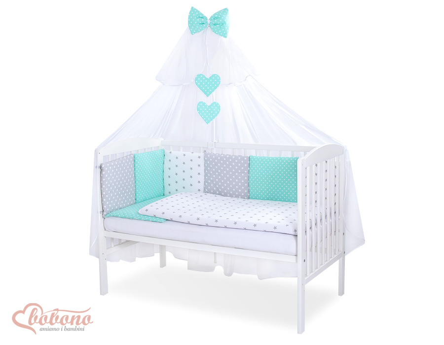 The 11-pcs set includes: 1. Double-sided pillow cover 40x60 cm (fabric 100% Cotton) 2. Double-sided duvet cover 90x120cm or 100x135cm (fabric 100% Cotton) 3-8. Universal bumper 6pcs- the bumper is made of 6 pillows filled with a special non-allergic and breathable silicone Filling (certified OKOTEX). The size of one pillow is 32cm x 32cm. Cover of the bumper or made of 100% cotton. Pillows have fastening strips to match them each other. You can match the pillows in any order. It is a perfect decoration of baby cot. If we match every pillows together the bumper can be used as a playing mat for baby. 9. Mosquito-net made of Chiffon (470x160cm) 10. Bow+ 11. Hanging applications.