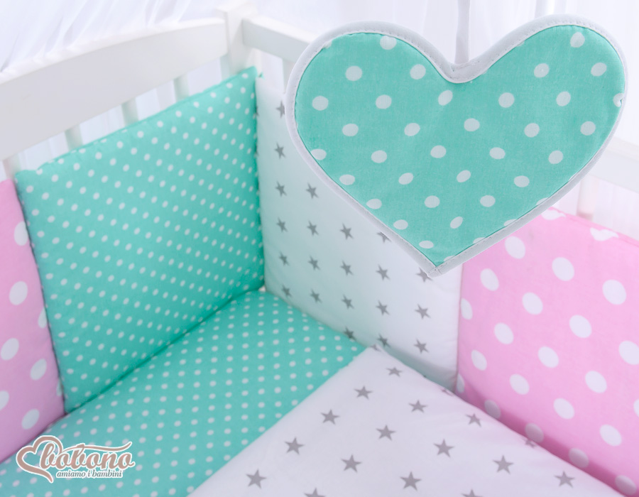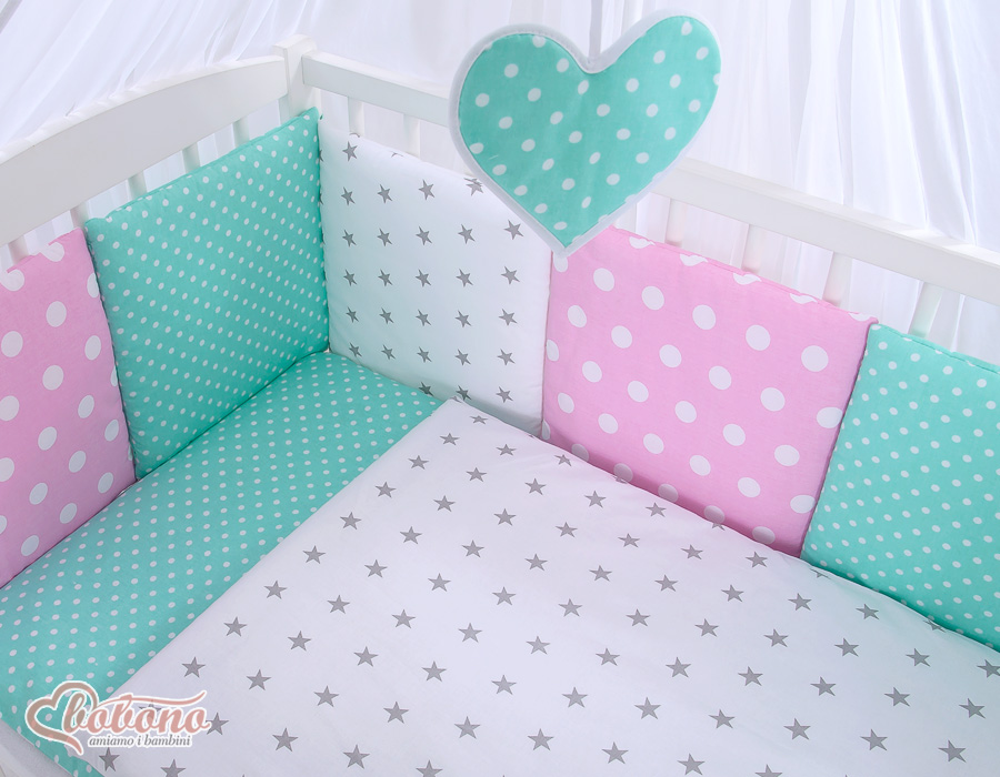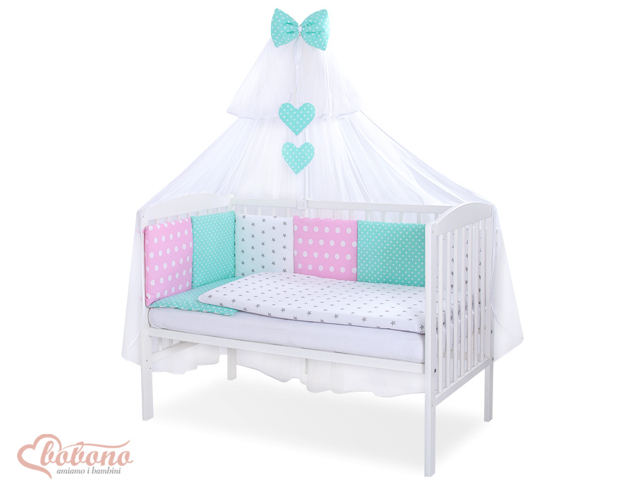The 11-pcs set includes: 1. Double-sided pillow cover 40x60 cm (fabric 100% Cotton) 2. Double-sided duvet cover 90x120cm or 100x135cm (fabric 100% Cotton) 3-8. Universal bumper 6pcs- the bumper is made of 6 pillows filled with a special non-allergic and breathable silicone Filling (certified OKOTEX). The size of one pillow is 32cm x 32cm. Cover of the bumper or made of 100% cotton. Pillows have fastening strips to match them each other. You can match the pillows in any order. It is a perfect decoration of baby cot. If we match every pillows together the bumper can be used as a playing mat for baby. 9. Mosquito-net made of Chiffon (470x160cm) 10. Bow+ 11. Hanging applications.