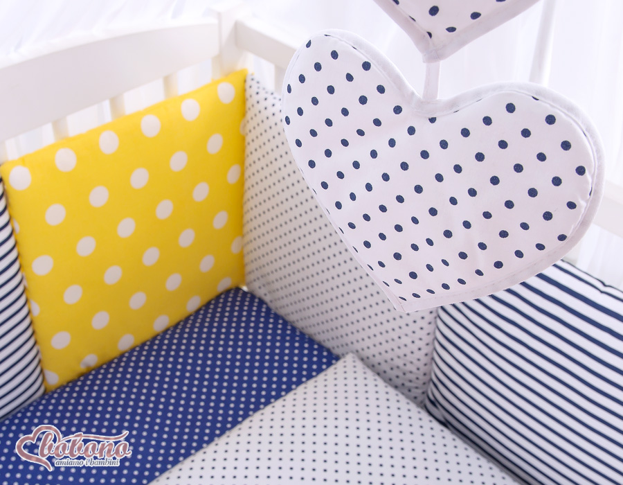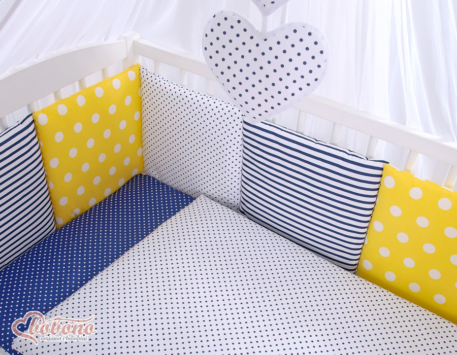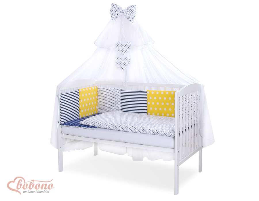 The 11-pcs set includes: 1. Double-sided pillow cover 40x60 cm (fabric 100% Cotton) 2. Double-sided duvet cover 90x120cm or 100x135cm (fabric 100% Cotton) 3-8. Universal bumper 6pcs- the bumper is made of 6 pillows filled with a special non-allergic and breathable silicone Filling (certified OKOTEX). The size of one pillow is 32cm x 32cm. Cover of the bumper or made of 100% cotton. Pillows have fastening strips to match them each other. You can match the pillows in any order. It is a perfect decoration of baby cot. If we match every pillows together the bumper can be used as a playing mat for baby. 9. Mosquito-net made of Chiffon (470x160cm) 10. Bow+ 11. Hanging applications.