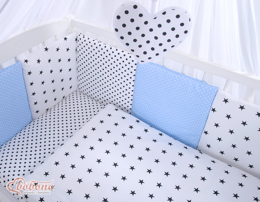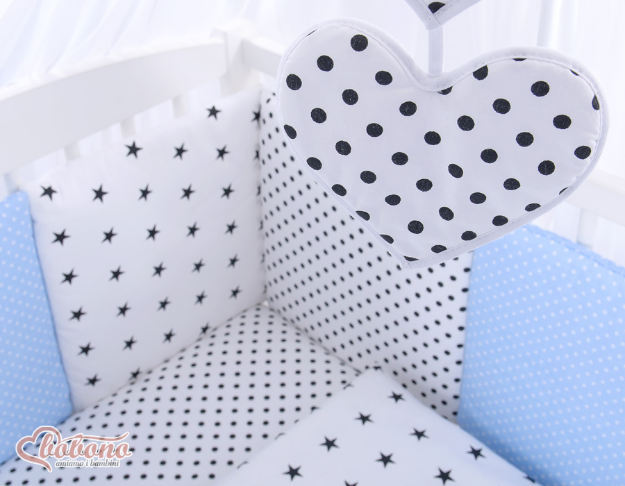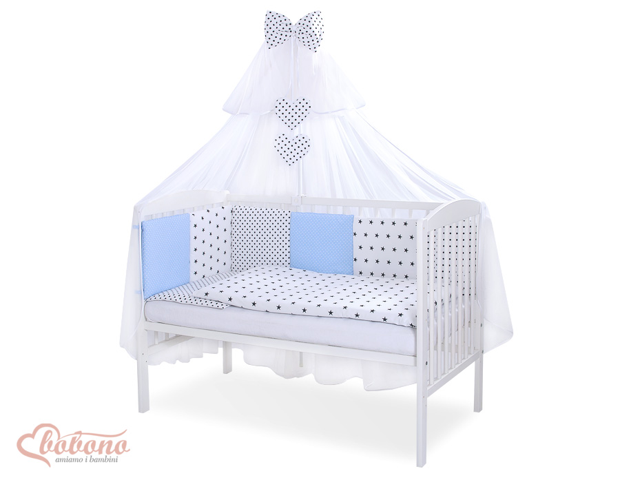 The 11-pcs set includes: 1. Double-sided pillow cover 40x60 cm (fabric 100% Cotton) 2. Double-sided duvet cover 90x120cm or 100x135cm (fabric 100% Cotton) 3-8. Universal bumper 6pcs- the bumper is made of 6 pillows filled with a special non-allergic and breathable silicone Filling (certified OKOTEX). The size of one pillow is 32cm x 32cm. Cover of the bumper or made of 100% cotton. Pillows have fastening strips to match them each other. You can match the pillows in any order. It is a perfect decoration of baby cot. If we match every pillows together the bumper can be used as a playing mat for baby. 9. Mosquito-net made of Chiffon (470x160cm) 10. Bow+ 11. Hanging applications.