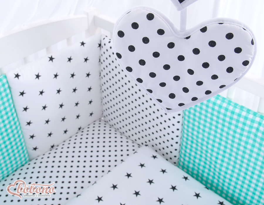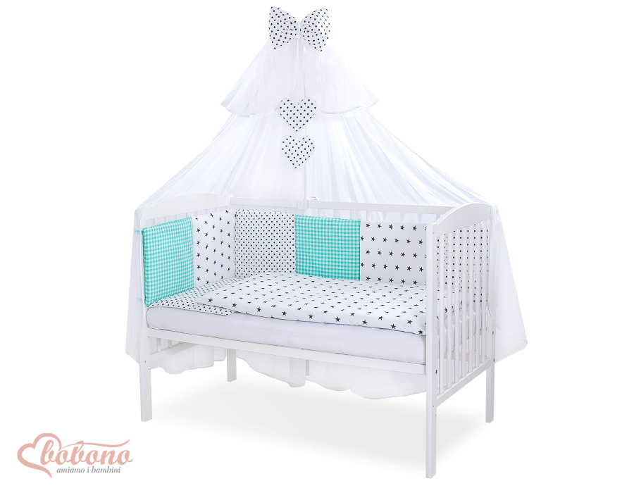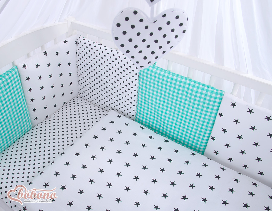The 11-pcs set includes: 1. Double-sided pillow cover 40x60 cm (fabric 100% Cotton) 2. Double-sided duvet cover 90x120cm or 100x135cm (fabric 100% Cotton) 3-8. Universal bumper 6pcs- the bumper is made of 6 pillows filled with a special non-allergic and breathable silicone Filling (certified OKOTEX). The size of one pillow is 32cm x 32cm. Cover of the bumper or made of 100% cotton. Pillows have fastening strips to match them each other. You can match the pillows in any order. It is a perfect decoration of baby cot. If we match every pillows together the bumper can be used as a playing mat for baby. 9. Mosquito-net made of Chiffon (470x160cm) 10. Bow+ 11. Hanging applications.
