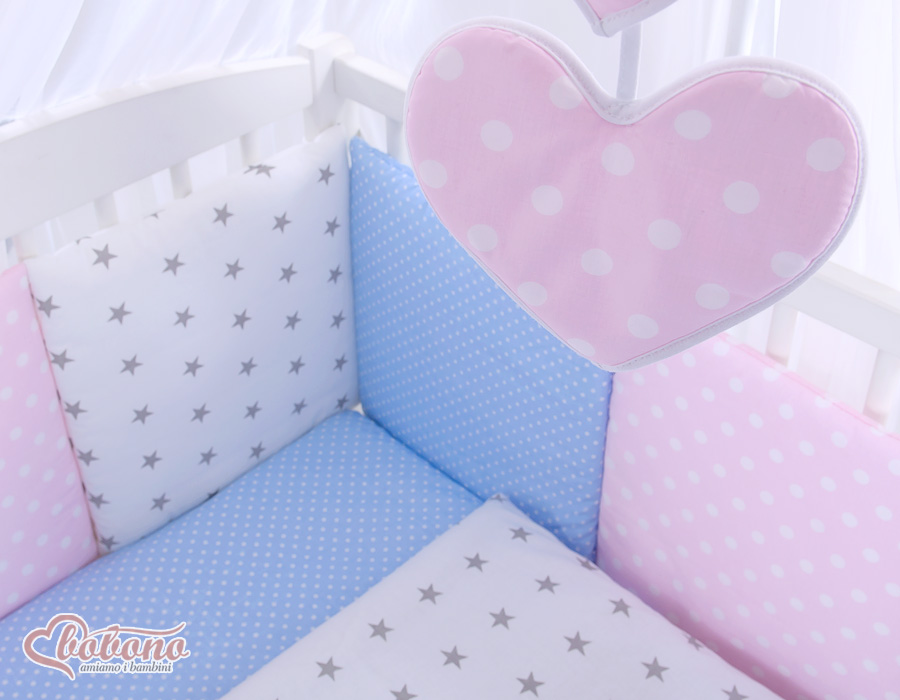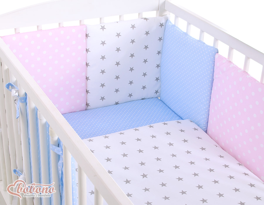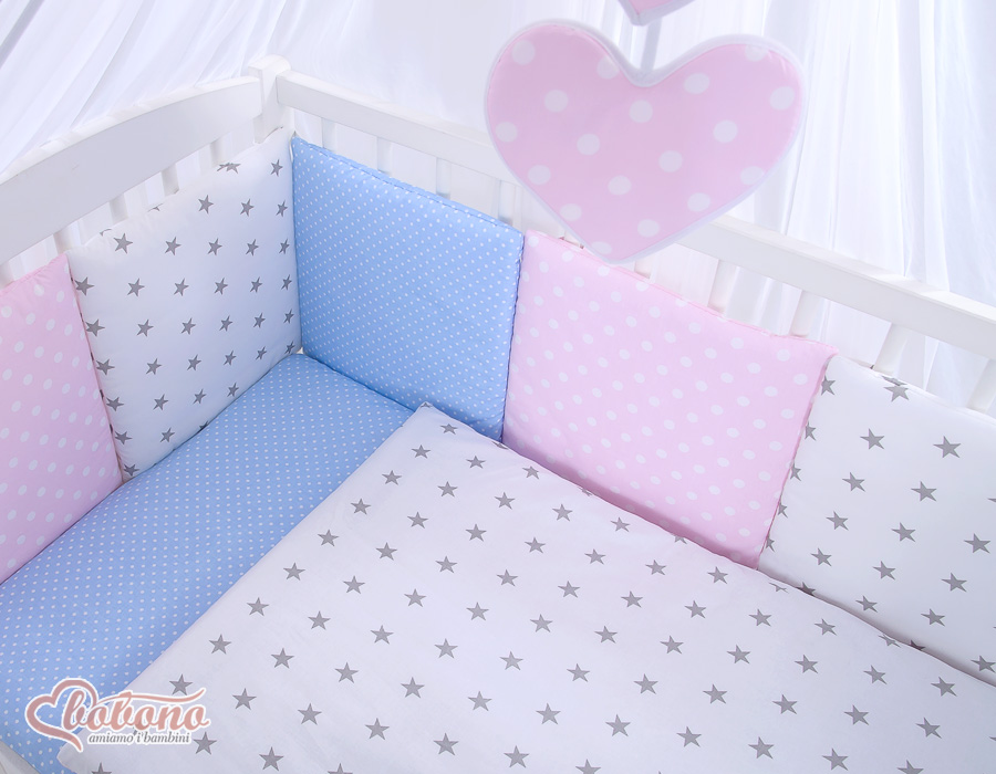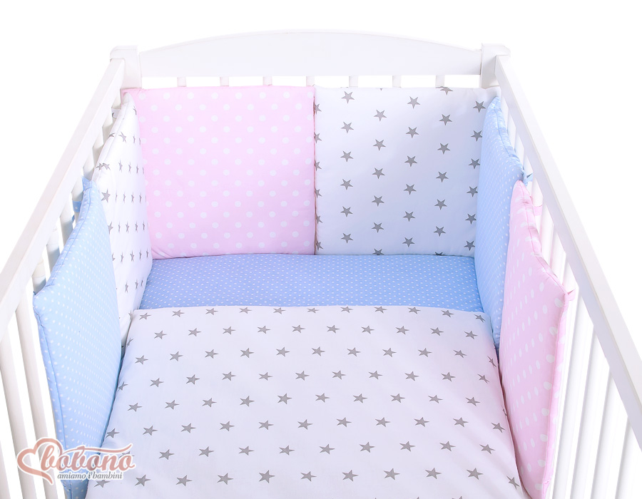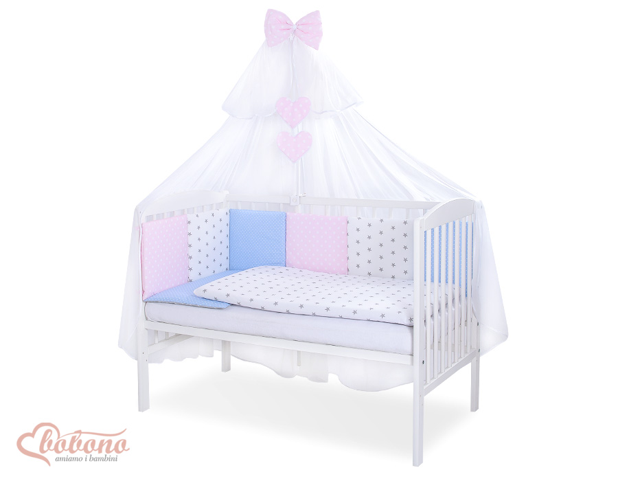 The 11-pcs set includes: 1. Double-sided pillow cover 40x60 cm (fabric 100% Cotton) 2. Double-sided duvet cover 90x120cm or 100x135cm (fabric 100% Cotton) 3-8. Universal bumper 6pcs- the bumper is made of 6 pillows filled with a special non-allergic and breathable silicone Filling (certified OKOTEX). The size of one pillow is 32cm x 32cm. Cover of the bumper or made of 100% cotton. Pillows have fastening strips to match them each other. You can match the pillows in any order. It is a perfect decoration of baby cot. If we match every pillows together the bumper can be used as a playing mat for baby. 9. Mosquito-net made of Chiffon (470x160cm) 10. Bow+ 11. Hanging applications.